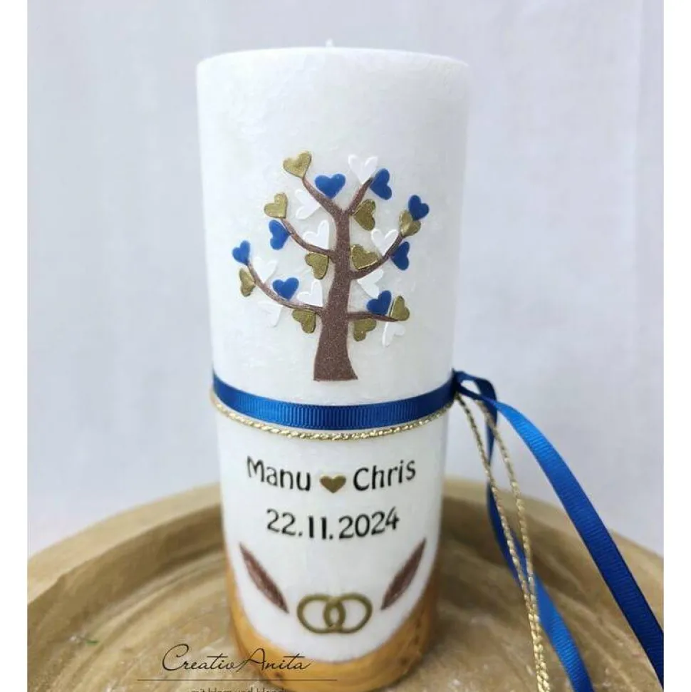 Die Kerze ziert einen Baum mit Herzen in den Farben blau, braun metallic und gold – gerne auch in Wunschfarbe.