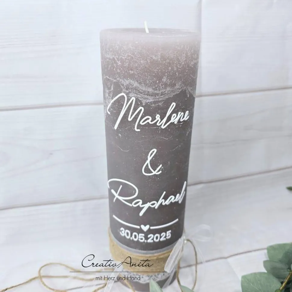 Die Rustikkerze ist taupe-braun – gerne auch in einer anderen verfügbaren Farbe.