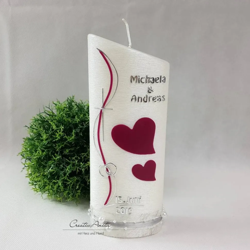 Gerne personalisieren wir die Kerze auch mit zwei Namen und Hochzeitsdatum mit Wachsbuchstaben.