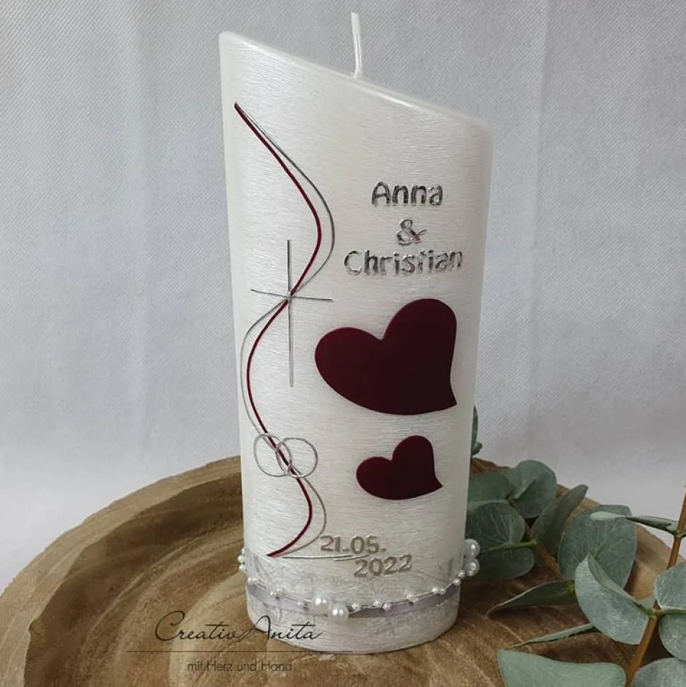 Gerne personalisieren wir die Kerze auch mit zwei Namen und Hochzeitsdatum mit Wachsbuchstaben in silber.
