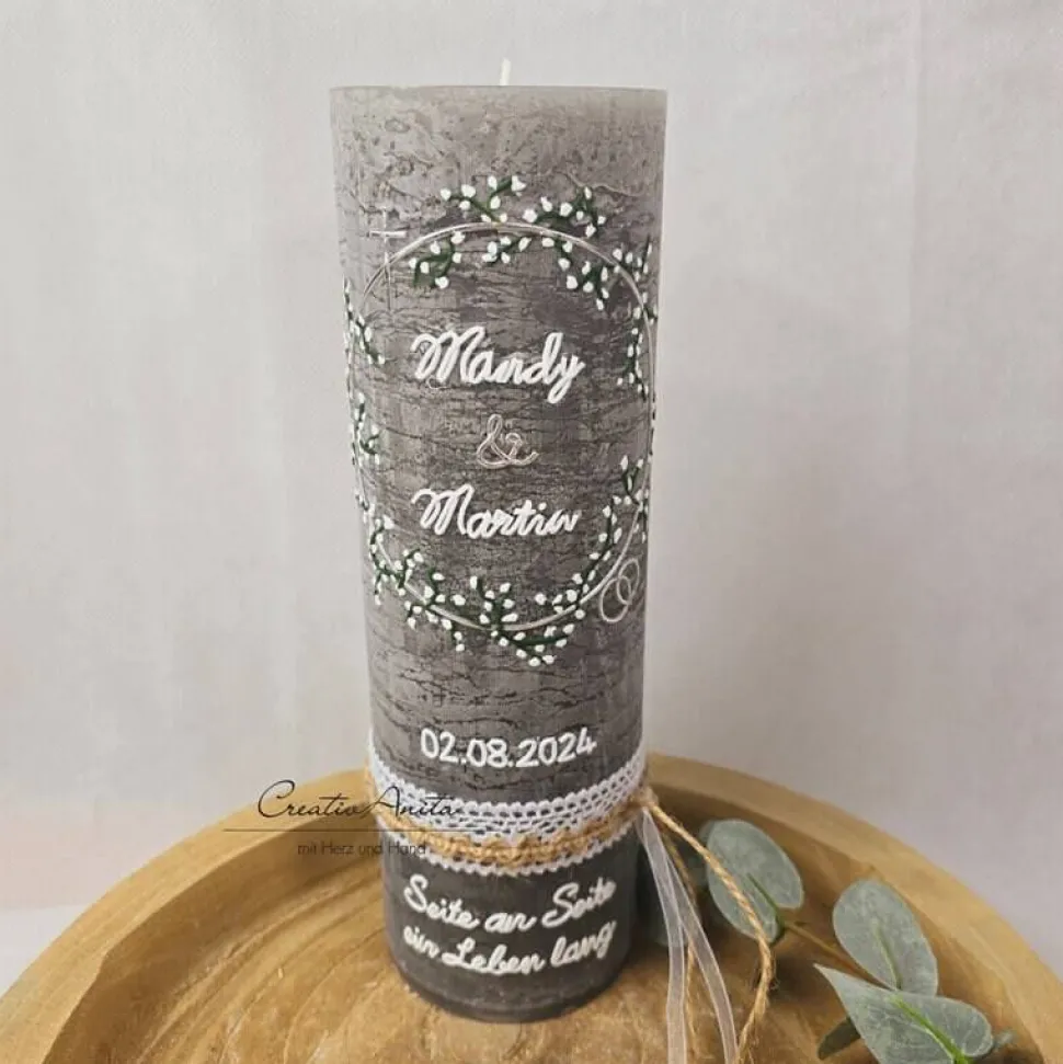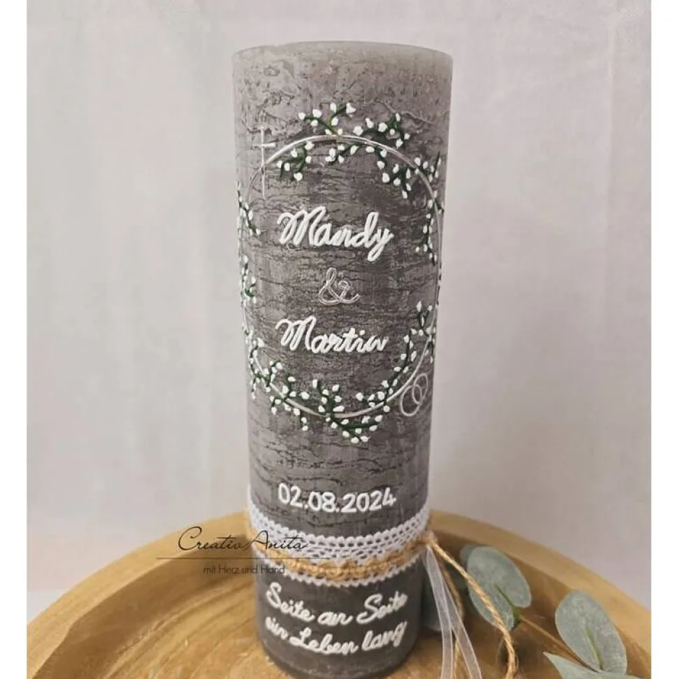 Der Trauspruch auf der Kerze ist inklusive. Wünschen Sie einen anderen oder längeren Spruch, kann es sein, dass weitere Kosten entstehen – bitte vorher anfragen.