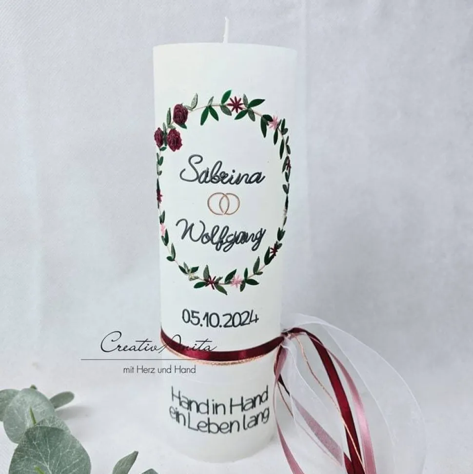 Den Abschluß der Kerze bilden hochwertige Schleifen-, Spitzen- und Jutebänder.