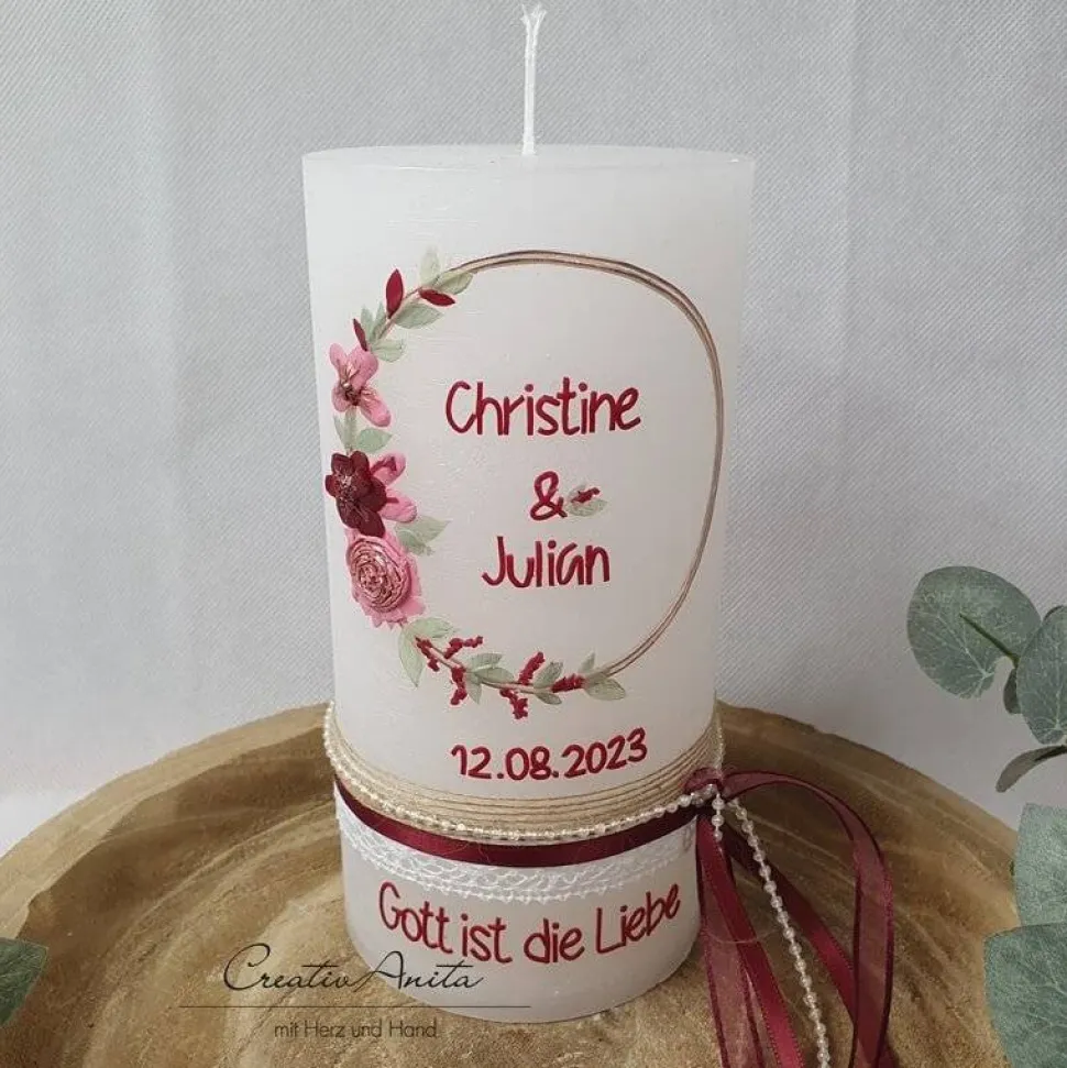 Die Rustikkerze ist weiß. Kerzendesign in den Farben roségold, bordeaux und altrosa.