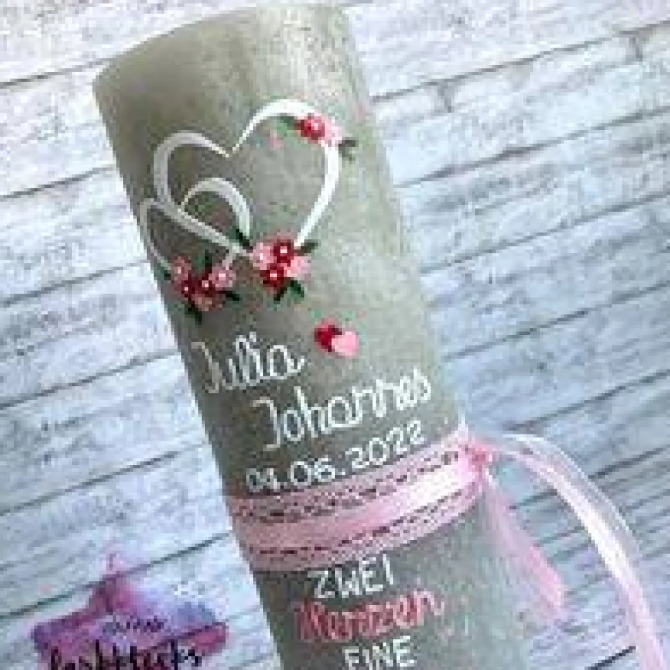 Mit schönem Spitzenband und kleinen Blumen. Der Spruch zwei Herzen, eine Liebe findet auch seinen Platz