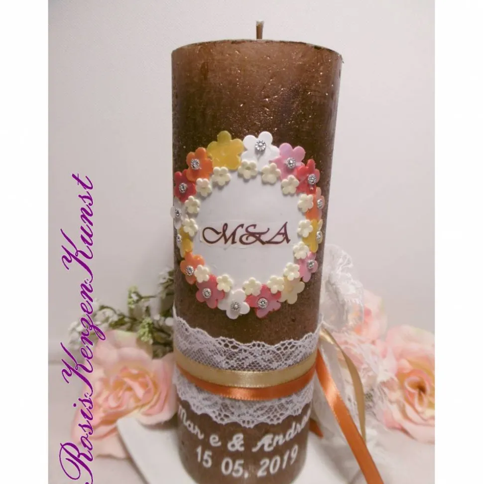 Material : Rustik-Kerze mit RAL-Gütezeichen in braun, Wachsplatten, Verzierwachsstreifen, Perlen, Kerzenschutzlack, Satinband, Spitzenband