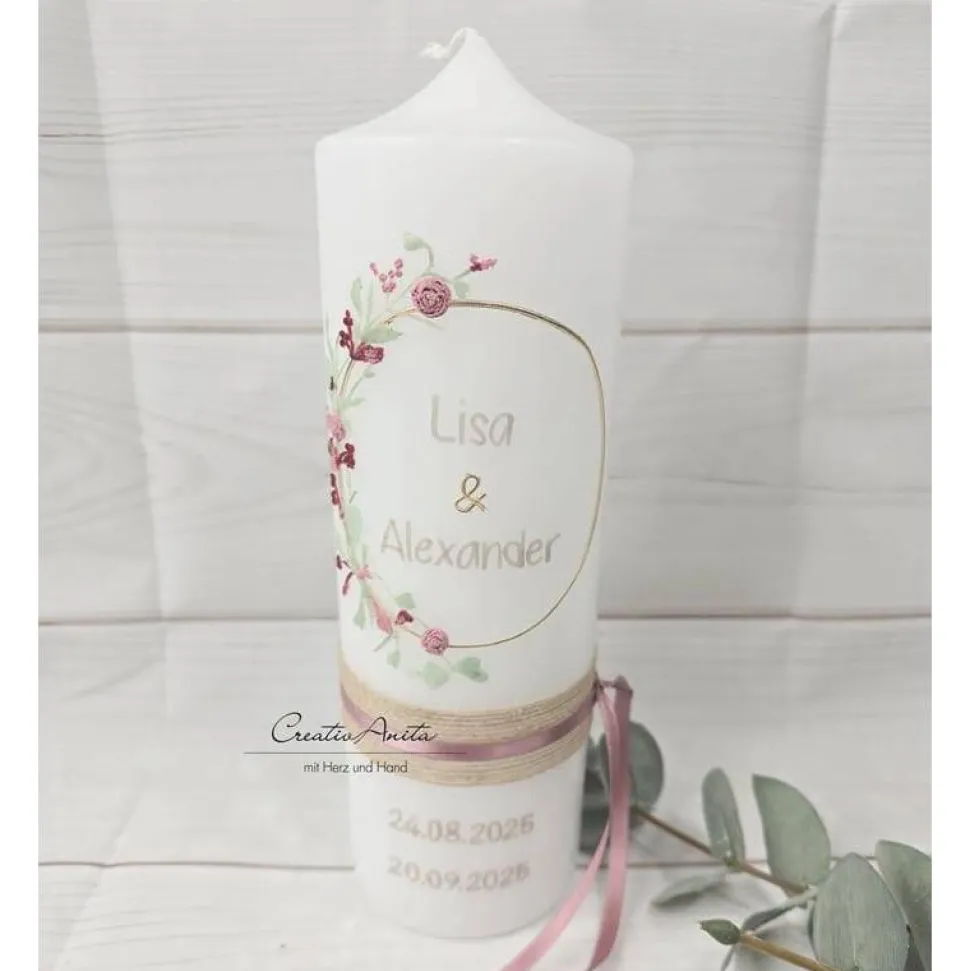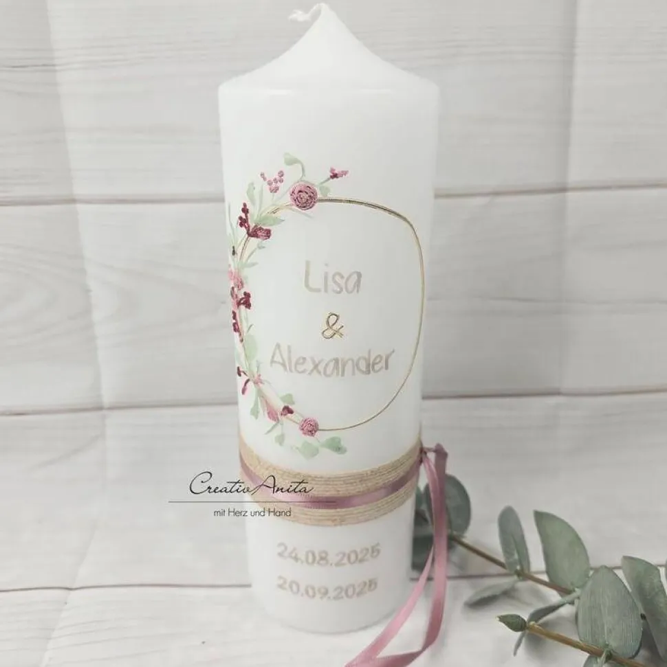 Die Kerze wird durch hochwertige Schleifen-, Spitzen- und Jutebänder aufgewertet.