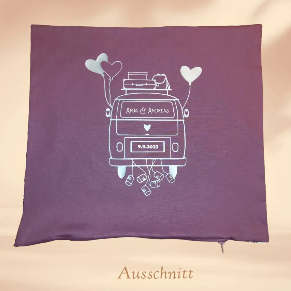 ➡ Individualisierung: Das Kissen kann mit dem Namen oder einem anderen Wunschtext für das Brautpaar versehen werden. Ebenso kann das Hochzeitsdatum im unteren Bereich beim Auto-Kennzeichen angebracht werden. Der Text wird je nach Länge im Bereich der „Windschutzscheibe“ aufgebügelt.