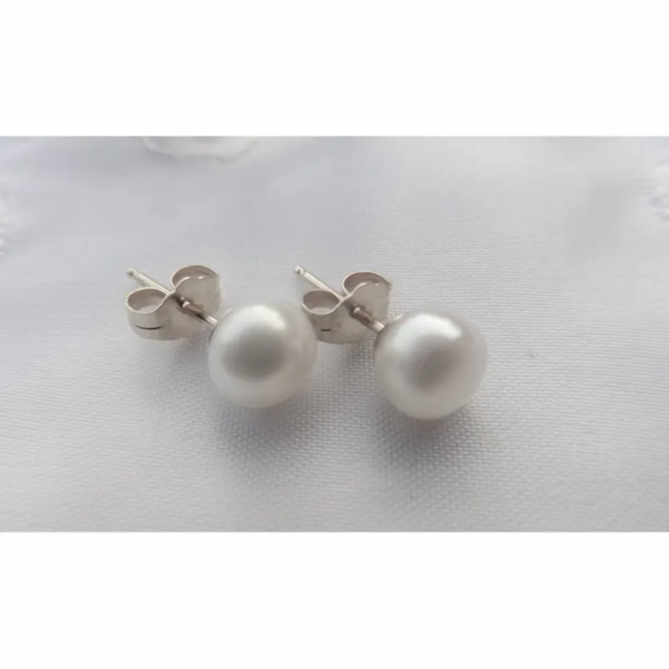 Als drittes gehören zu diesem Brautschmuck Ohrringe als Stecker in silber mit weißen Perlen. Sie können wählen zwischen ganz kleinen runden Perlen als Ministecker 4-5 mm und etwas größeren Perlen in Buttonform ( etwas flach gedrückt) in 6-7 mm.