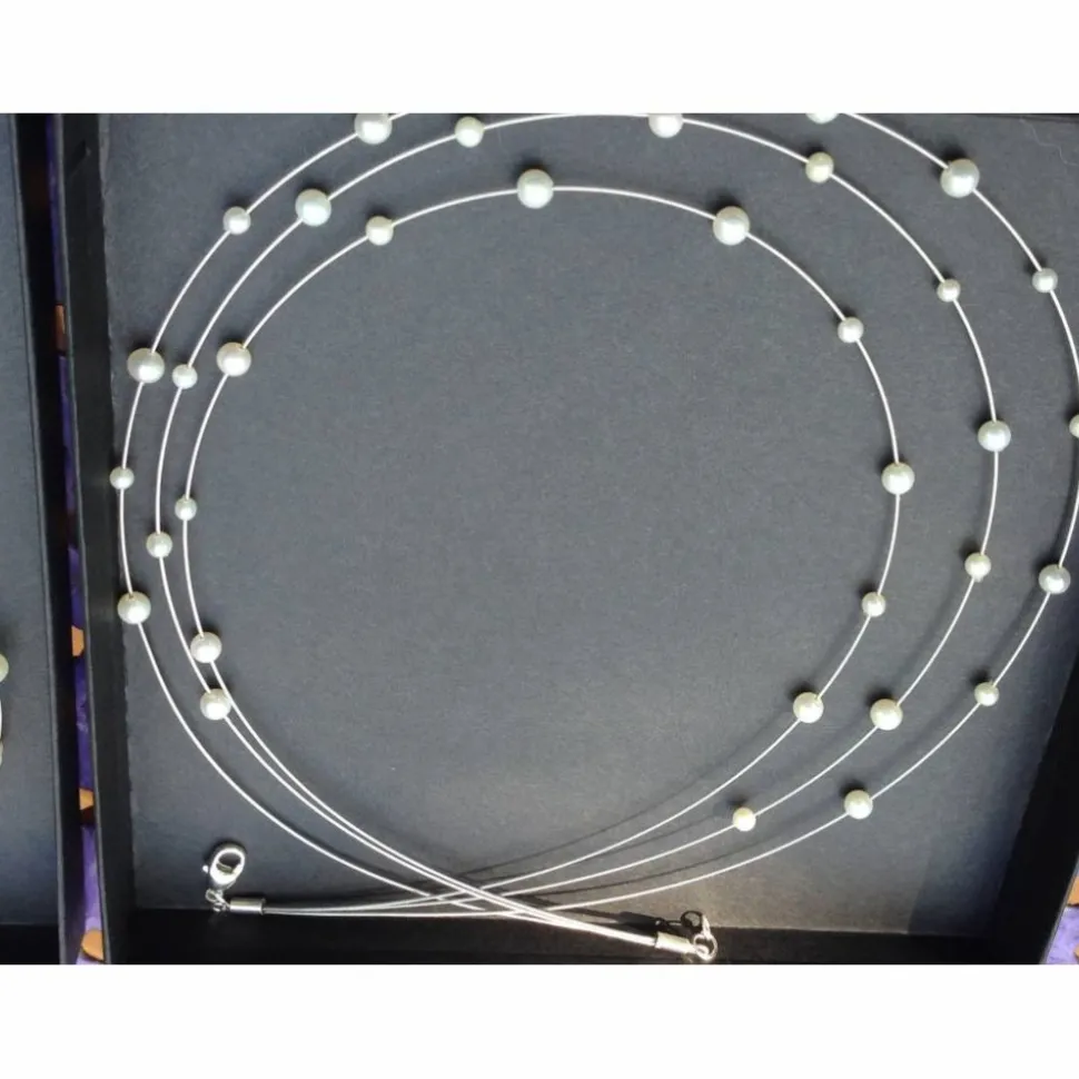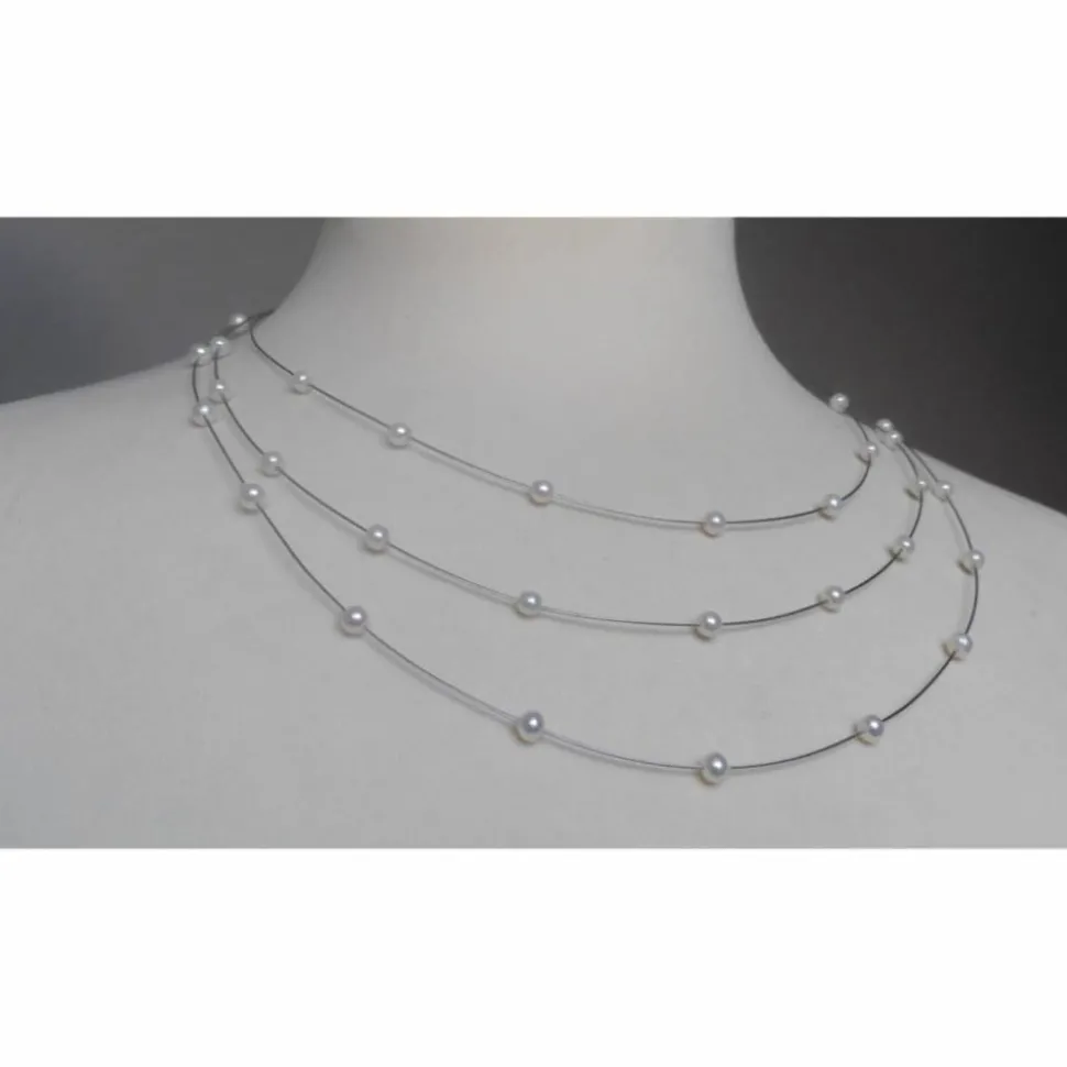Hier eine Perlenkette aus drei Reihen schwebender gleichmäßig runder echter Süsswasserperlen in 7 mm Größe auf ummanteltem Juwelierdraht.