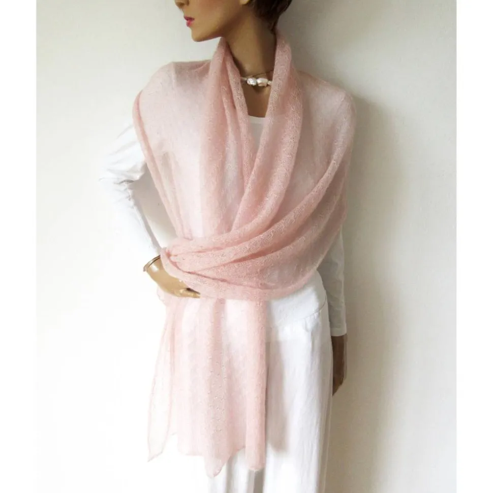 Das hochwertige Tuch aus feinstem Mohair garantiert nicht nur einen femininen Chic sondern wärmt auch in kühlen Räumen und Sommernächten. Die zarte Farbe und der dezente Glanz des Gold-Lurex Fadens verleihen dem handgefertigten Tuch eine elegante Note.