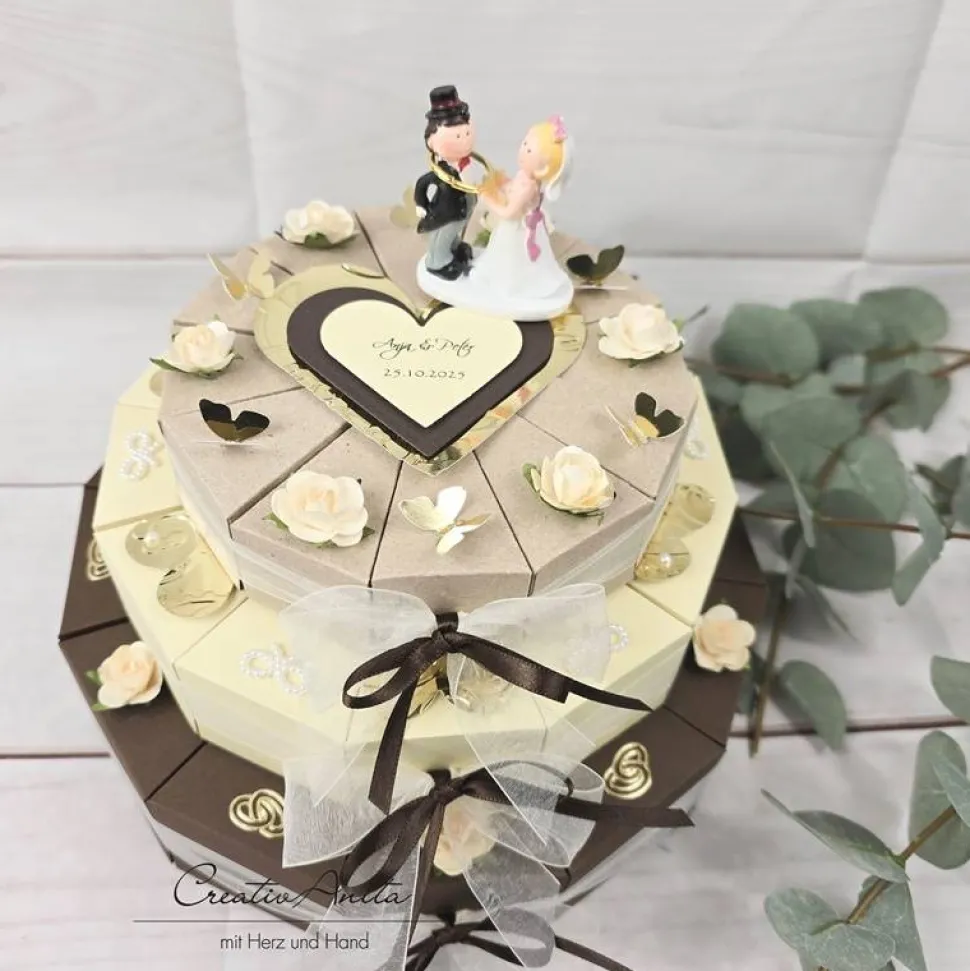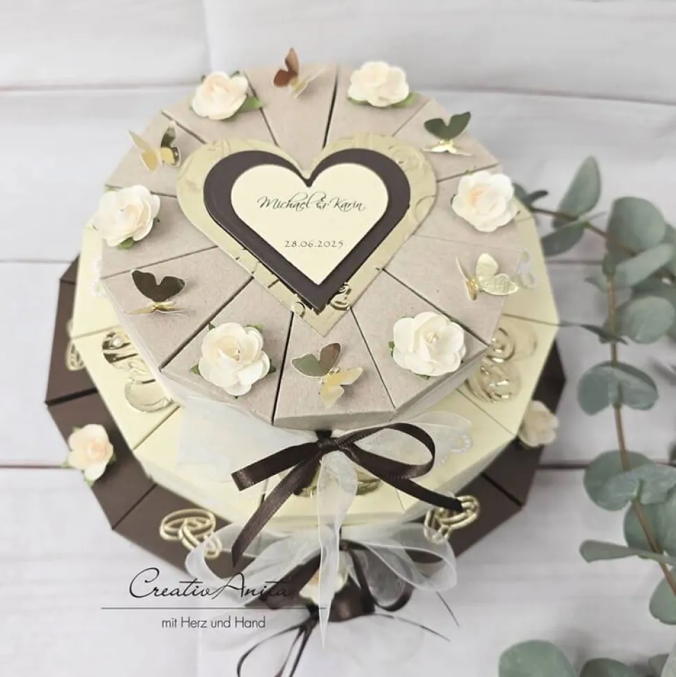 3×12 einzelne Tortenstücke, jedes einzeln nach Belieben befüllbar (z. B. mit Geld, Gutschein, Hochzeitsmandeln, Sprüchen, Süssigkeiten usw.)