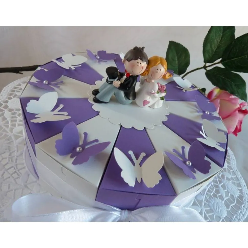 Da bietet sich meine aufwändig gearbeitete Schachteltorte aus lila-und cremefarbenem Tonkarton an, dekoriert mit Schmetterlingen, weißen Halbperlen ünd sitzendem Brautpaar.