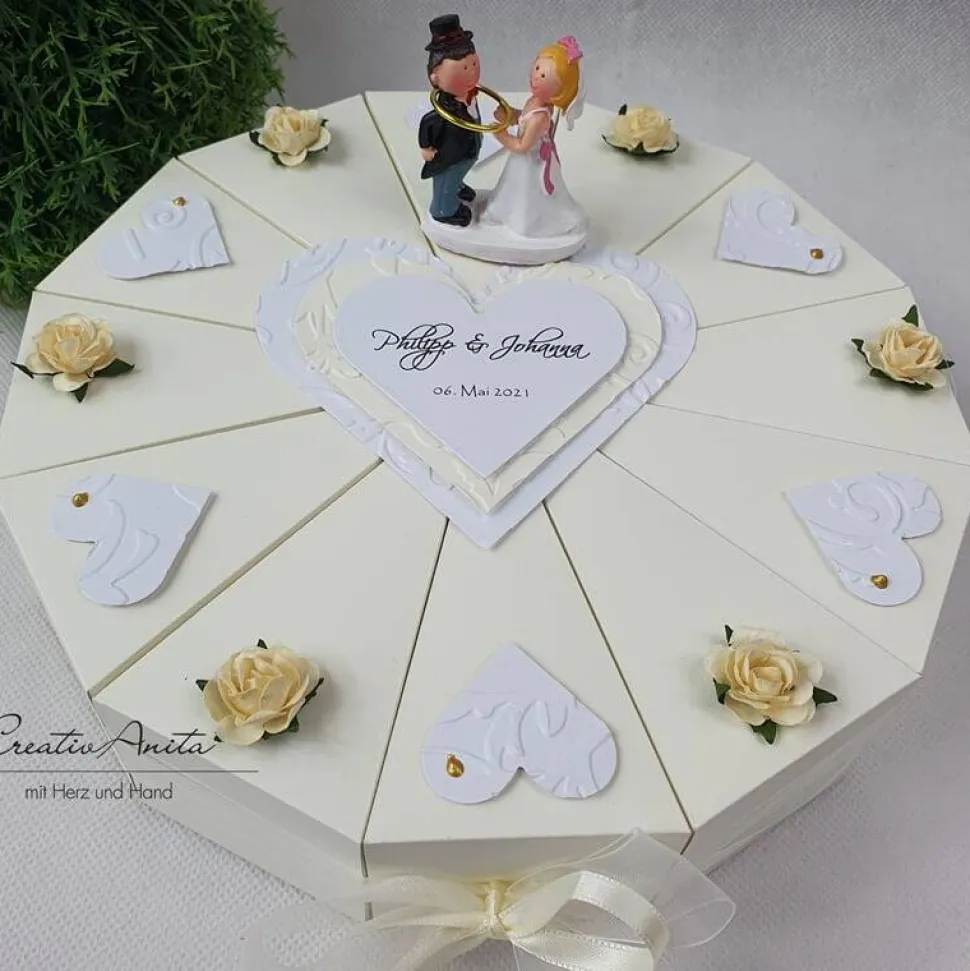 12 einzelne Tortenstücke, jedes einzeln nach Belieben befüllbar (z. B. mit Geld, Gutschein, Hochzeitsmandeln, Sprüchen, Süssigkeiten usw.)