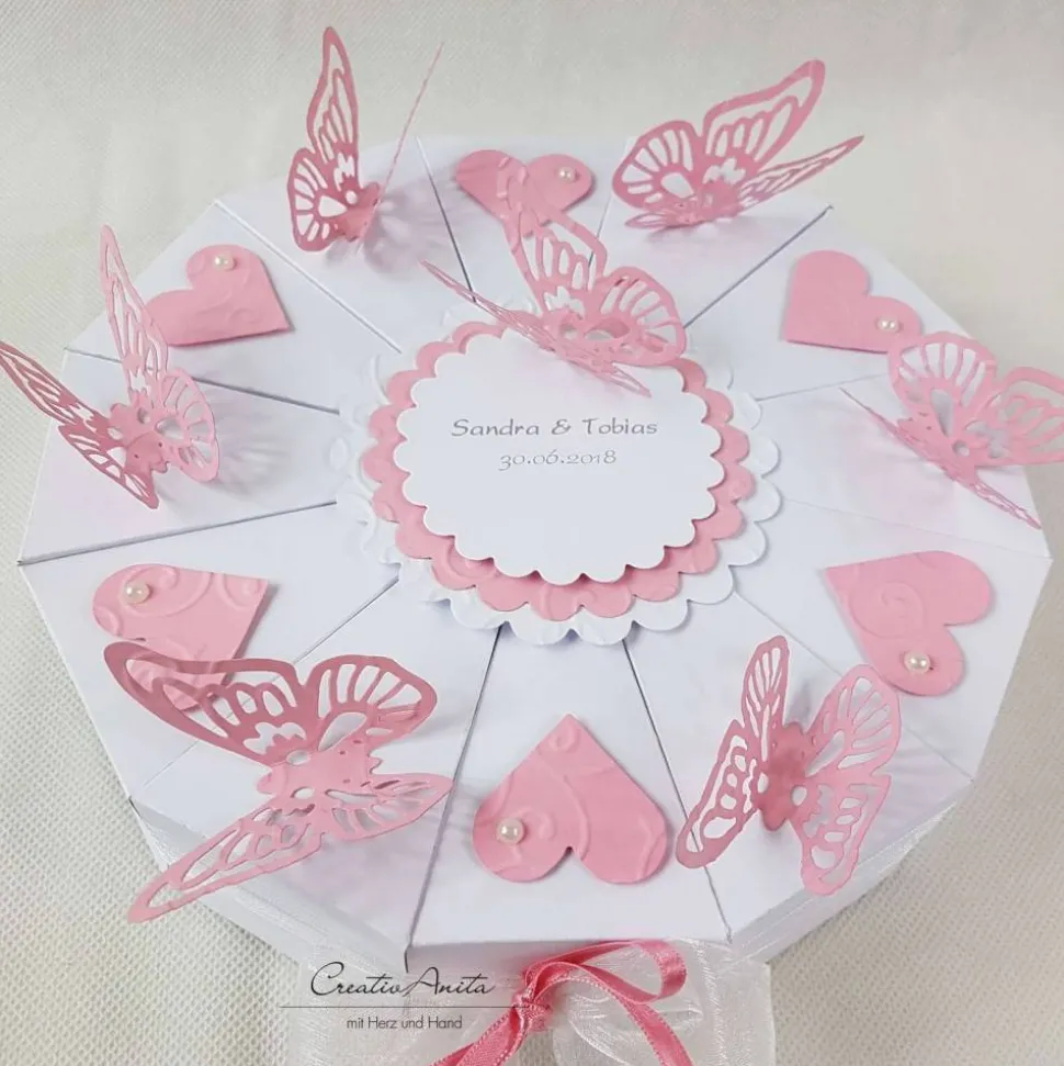 12 einzelne Tortenstücke, jedes einzeln nach Belieben befüllbar (z. B. mit Geld, Gutschein, Mini-Schafmilchseifen, Sprüchen, Süssigkeiten usw.)