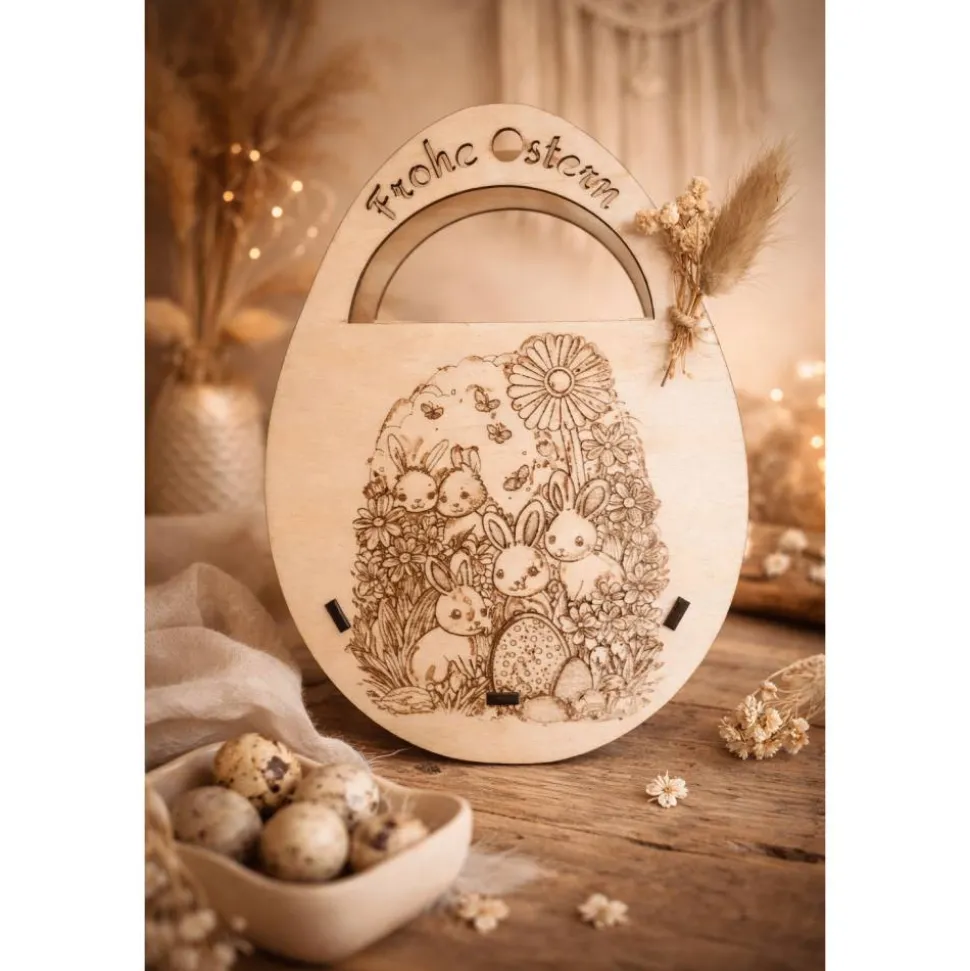 Dieses handgefertigte Osterkörbchen aus hochwertigem Holz überzeugt durch ein detailreiches Hasen- und Blumenmotiv, das per Gravur aufgebracht ist. Der Schriftzug „Frohe Ostern“ macht das Körbchen zu einem echten Blickfang.