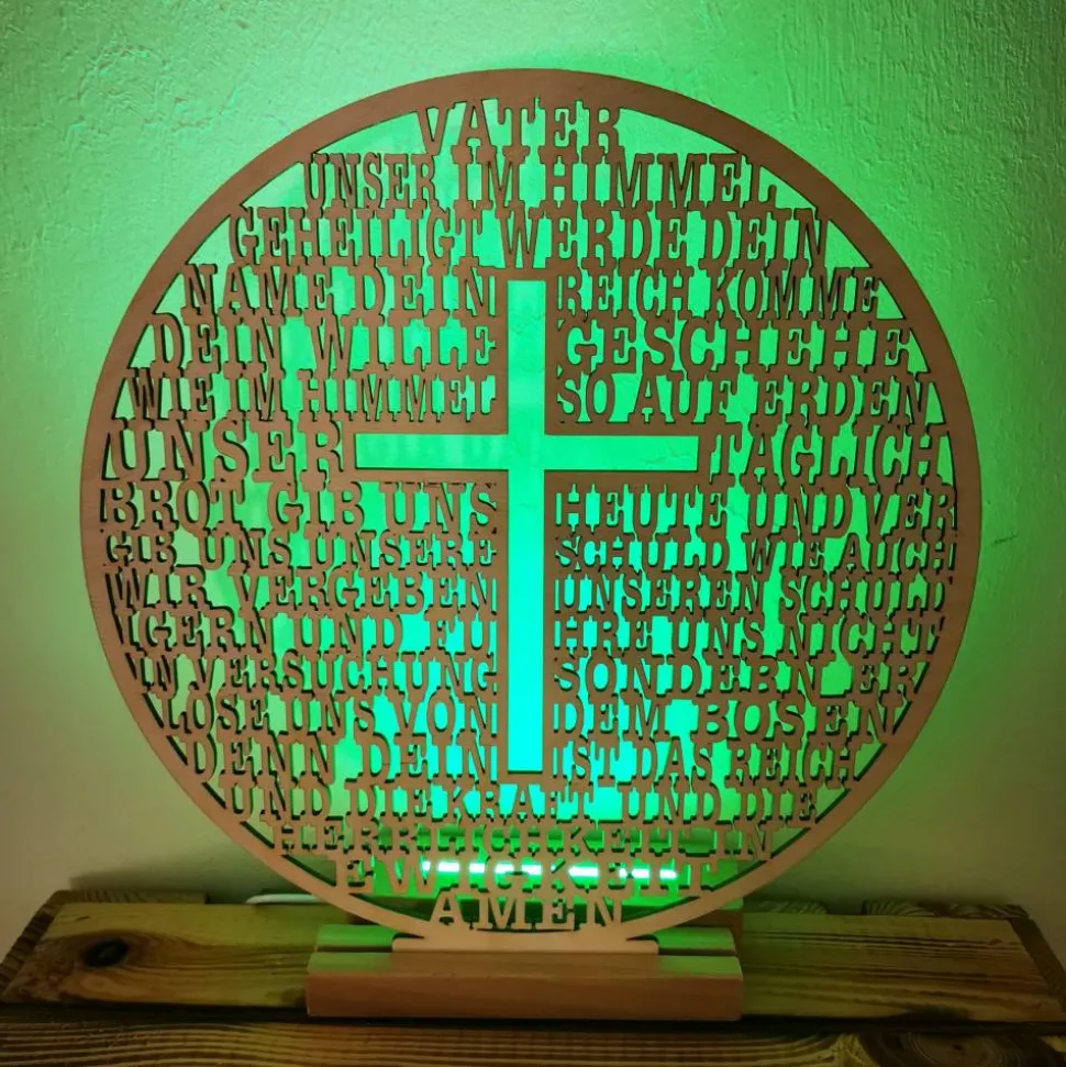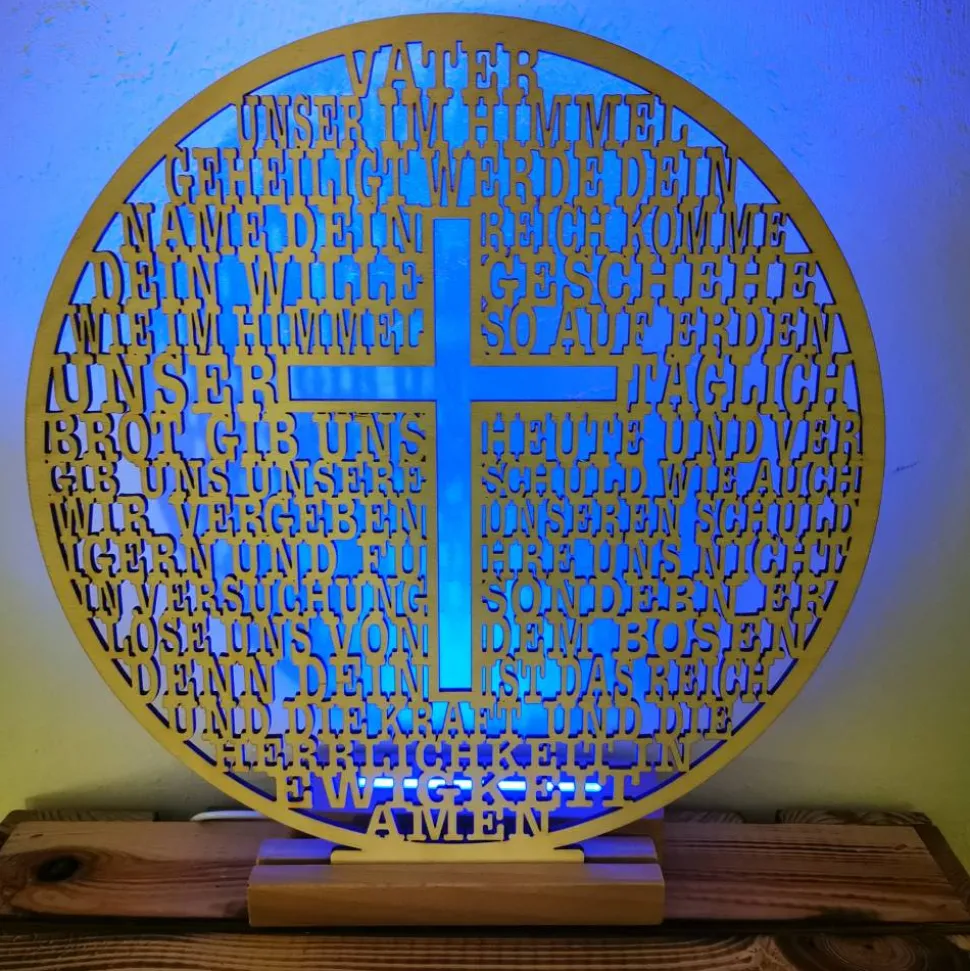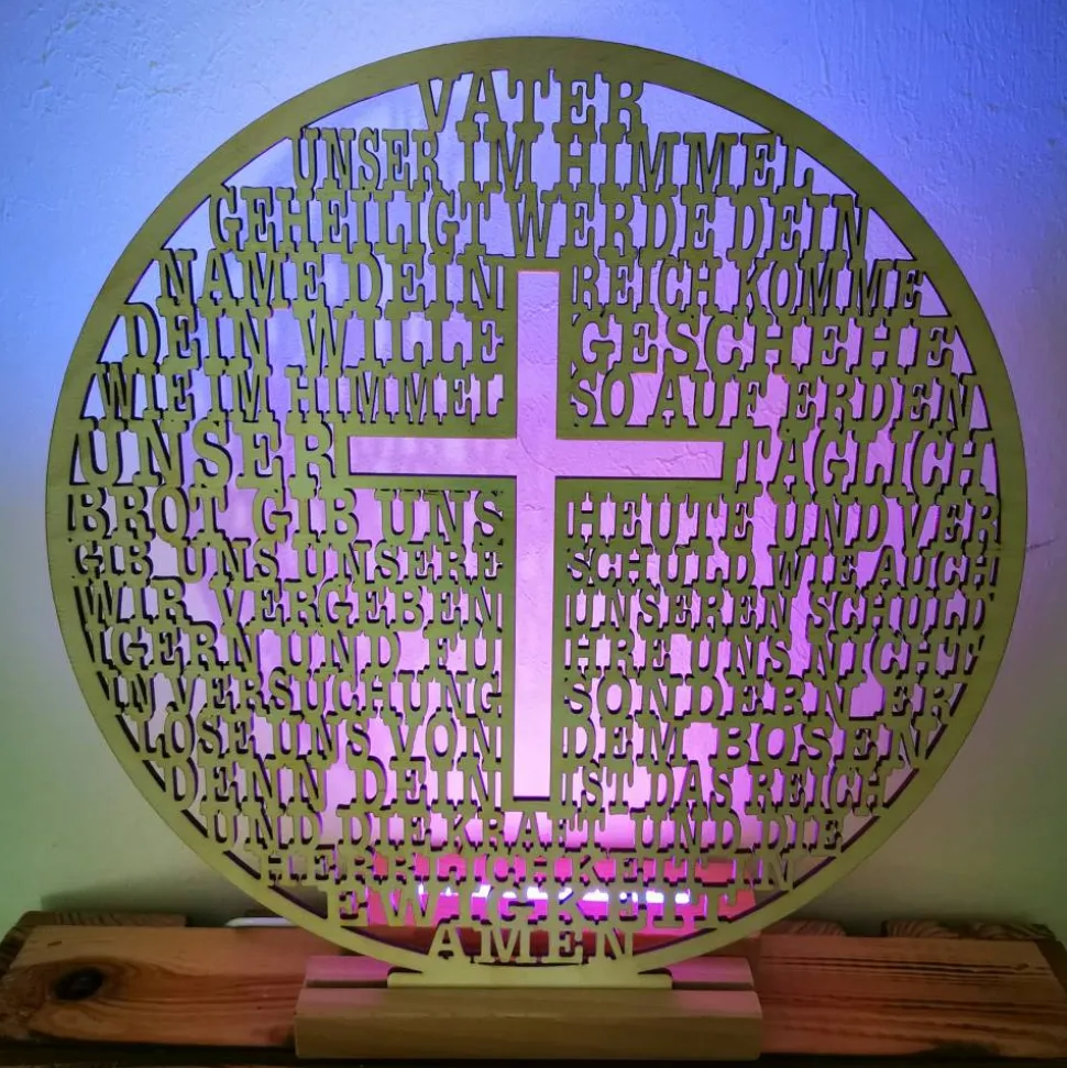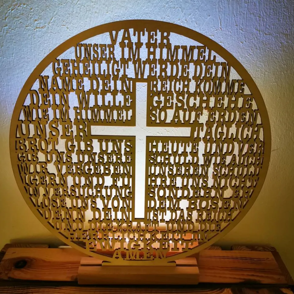 Du kannst den Vater unser Holzaufsteller auf verschiedene Weise präsentieren: Beleuchte ihn mit einer Kerze im Glas, einer LED-Holzbasis oder hänge ihn auf. Die Holzbasis bietet dir zudem die Möglichkeit, eine persönliche Botschaft oder ein individuelles Motiv einzuarbeiten und den Aufsteller so zu einem einzigartigen Geschenk für besondere Anlässe wie Kommunion, Konfirmation oder Hochzeiten zu machen.