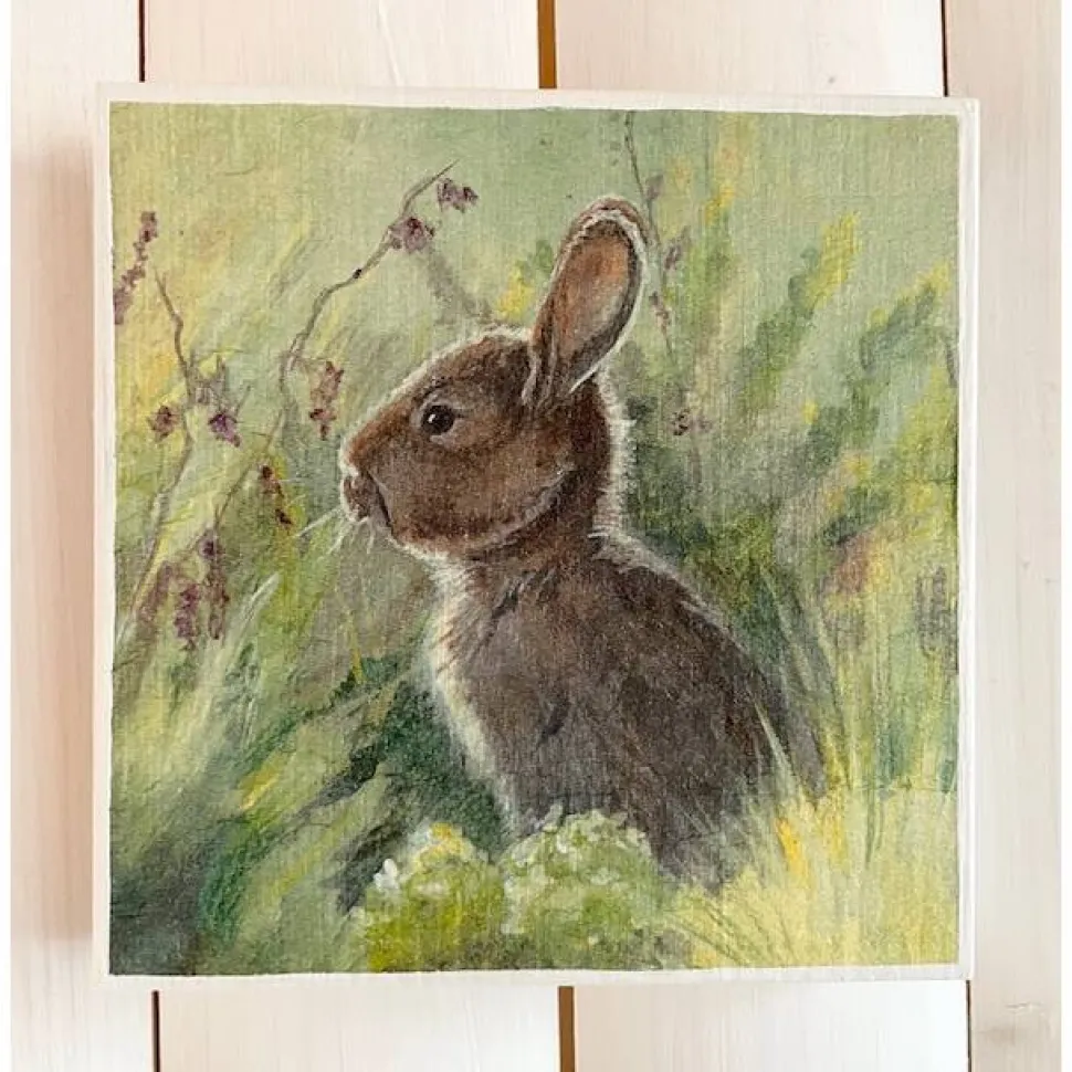 Holzbild, Hase auf grüner Wiese, Serviettentechnik auf Holzbrett. Süße Osterdeko.
