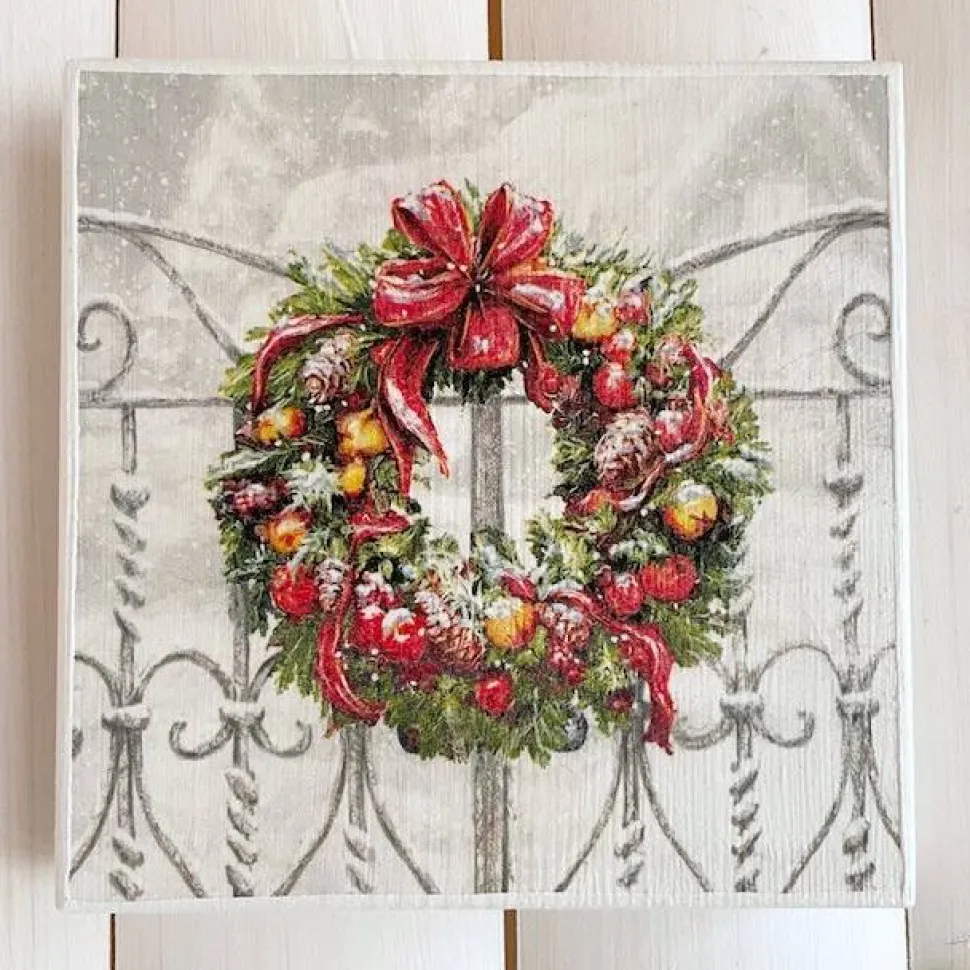 Holzbild, weihnachtlicher Kranz am Gartenzaun. Serviettentechnik auf Holzbrett.