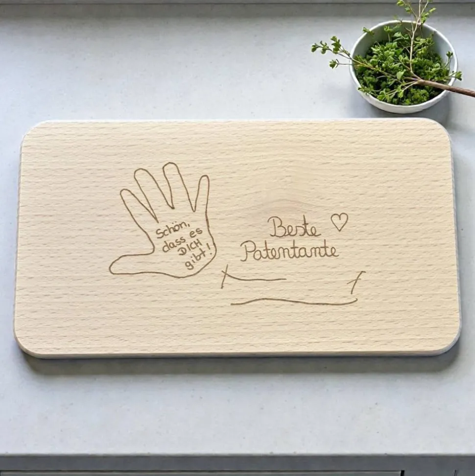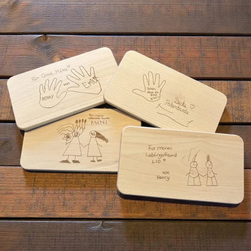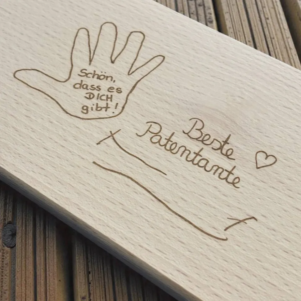 Die Gravur wird individuell nach den Wünschen der Kundinnen und Kunden angefertigt. Standardmäßig befindet sich unten rechts ein dezent gelaserter Schriftzug.