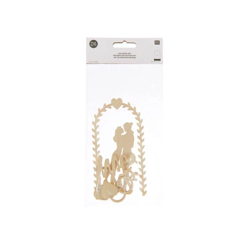 Mit dem 6-teiligen Set lässt sich zur Hochzeit dekorieren. Die Holzteile können unter Dekohauben oder auf Holzscheiben dekoriert werden. Mit Heißklebe lässt sich das Dekoset befestigen.