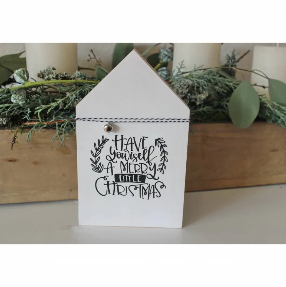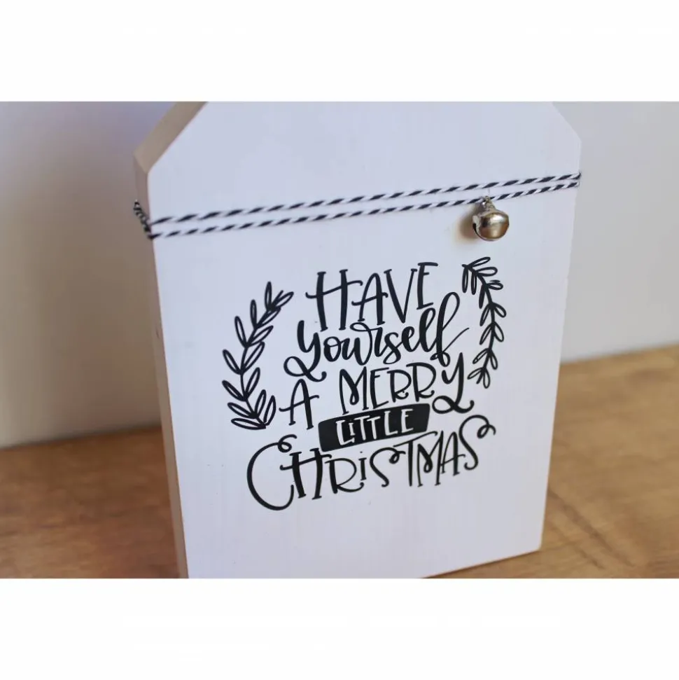 Das Häuschen ist mit dem Text des Weihnachtsklassikers „Have yourself a merry little Christmas“ aus schwarzer Vinylfolie und mit einem schwarz-weißen Bakertwine und einem kleinen Glöckchen dekoriert.