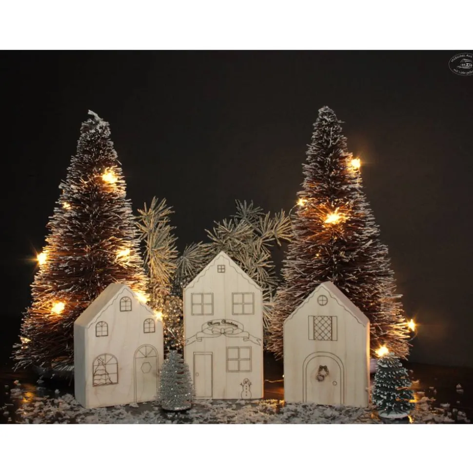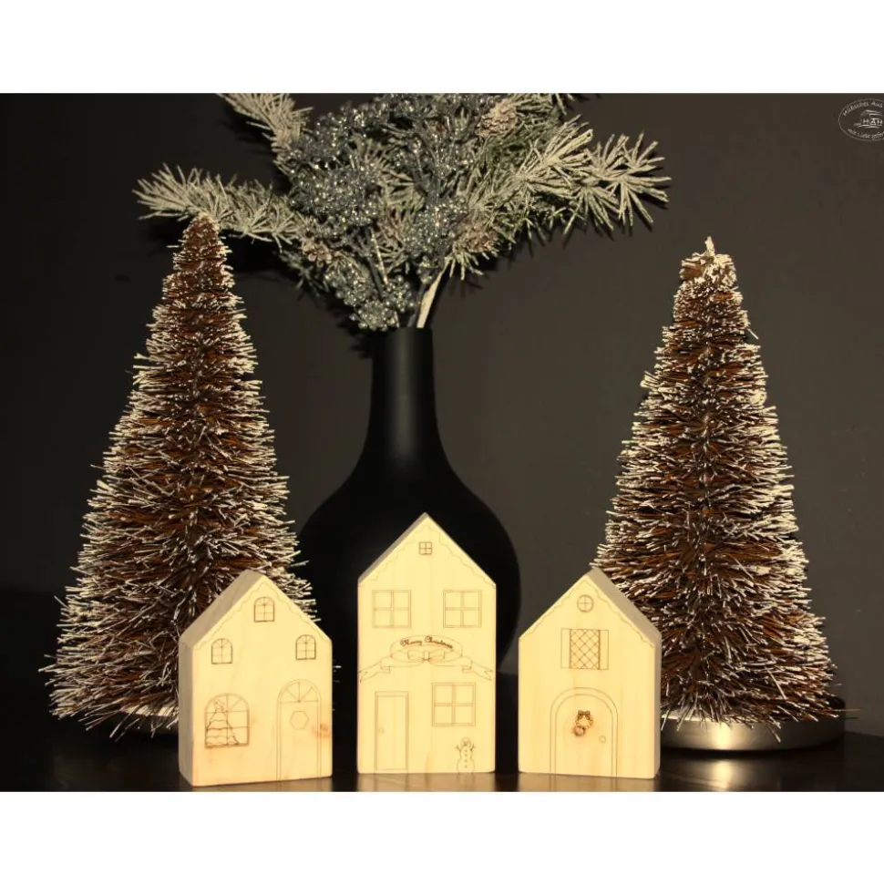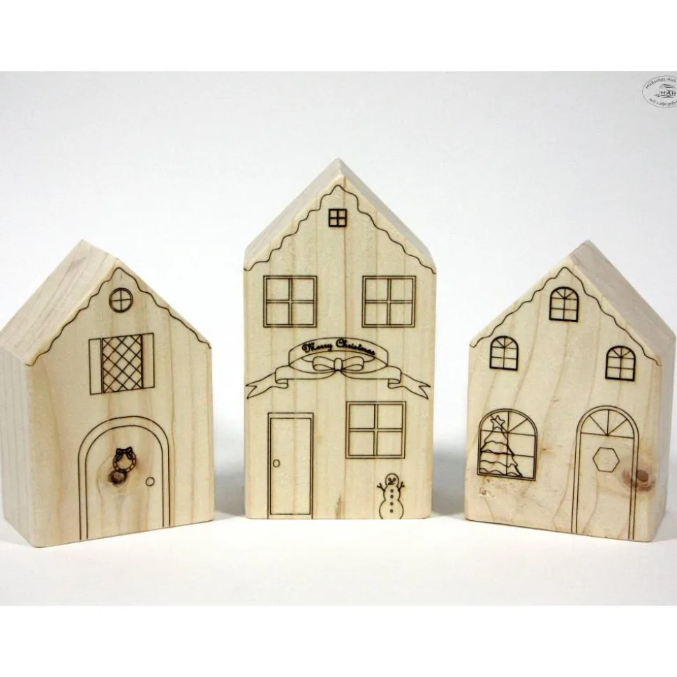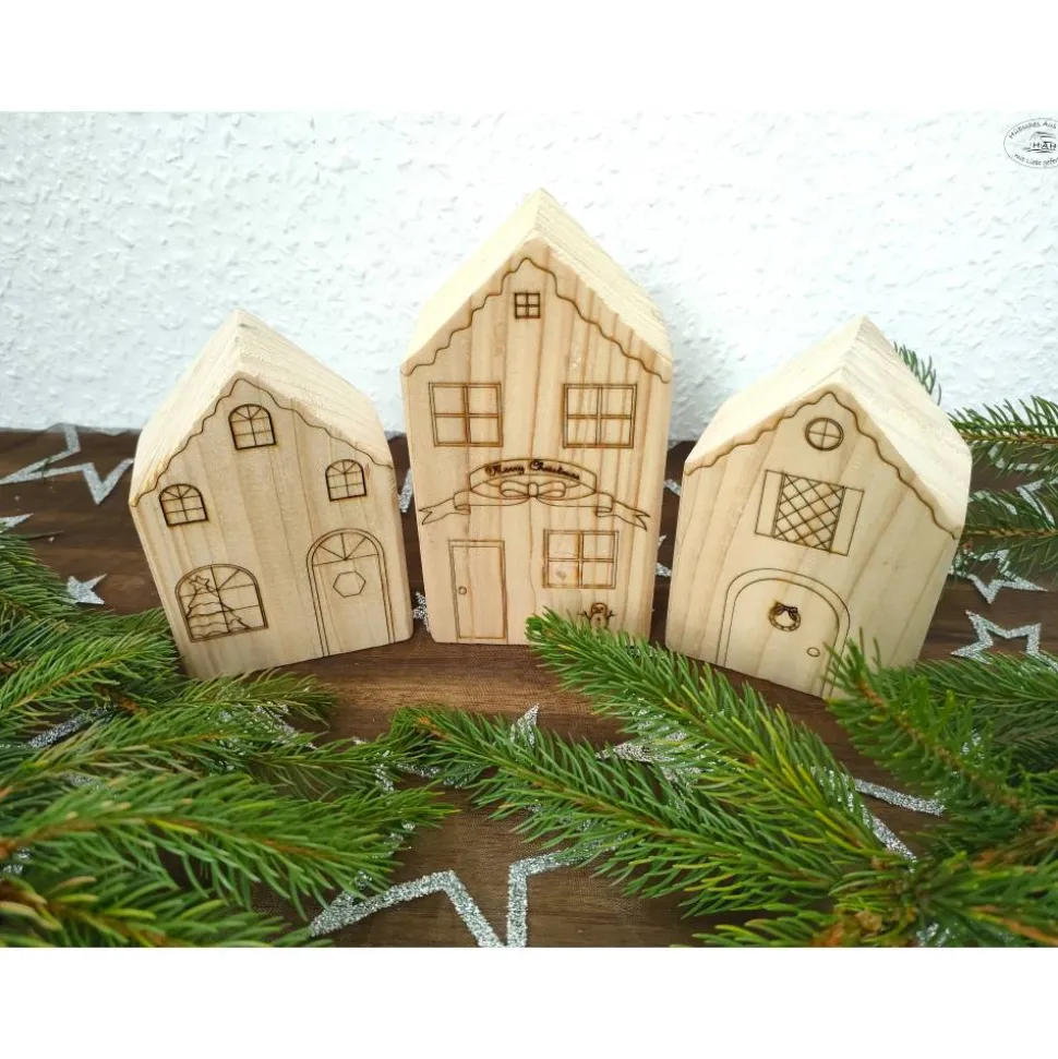 3er-SetHolzhäuschen in zwei verschiedenen Varianten, weihnachtlich graviert oder naturbelassen (auch zum bemalen geeignet)