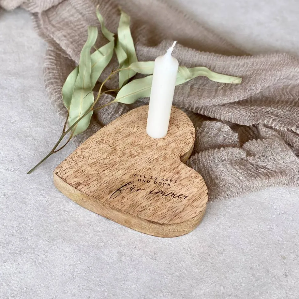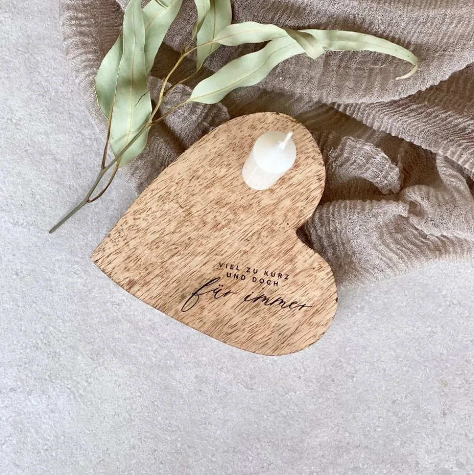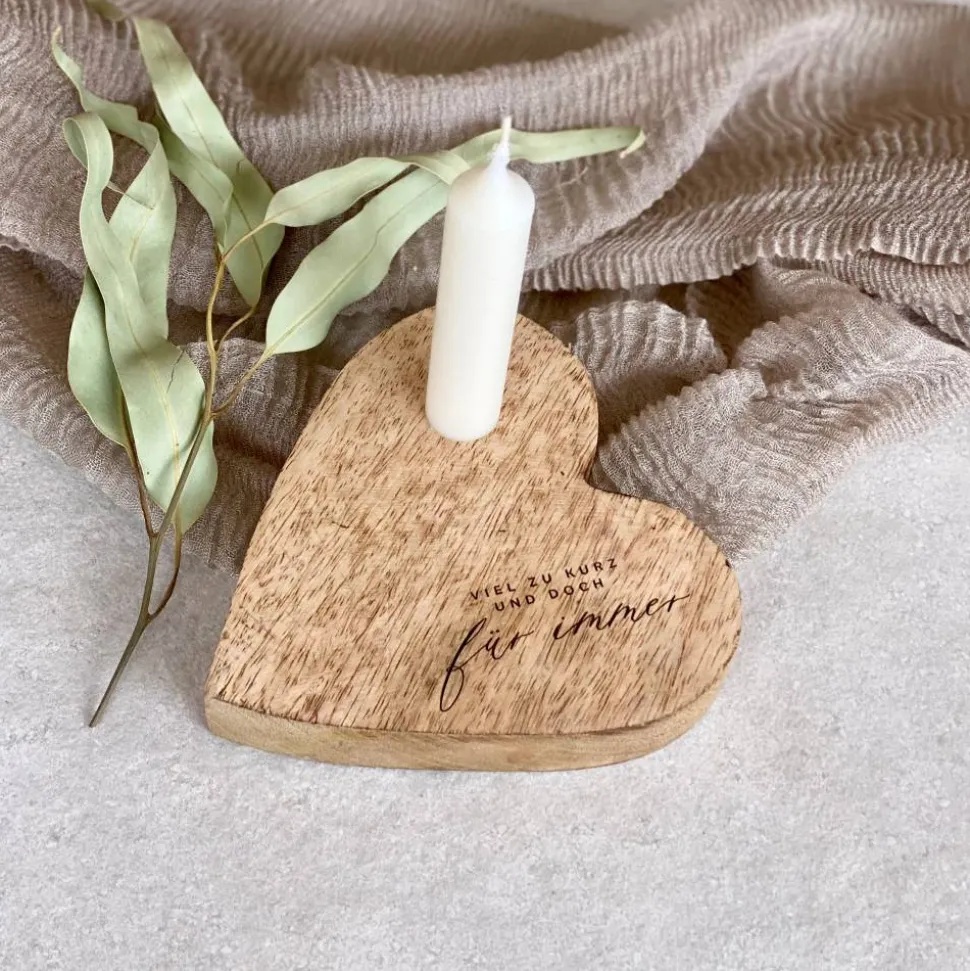 Holzherz mit gelaserter Schrift Viel zu kurz und doch für immer | Format 15x15cm, 2cm dick | Mangoholz | Stabkerze in wollweiß Durchmesser 22mm siehe Bild