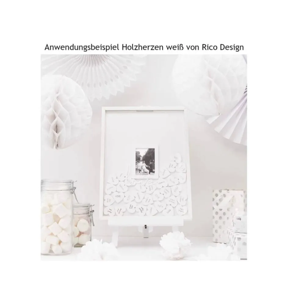 Die 20 Herzen stehen in 2 Farben zur Verfügung. Mit den Holzherzen lassen sich Gästebücher in Rahmen selbermachen. Die kleinen Herzen lassen sich bemalen oder beschriften.