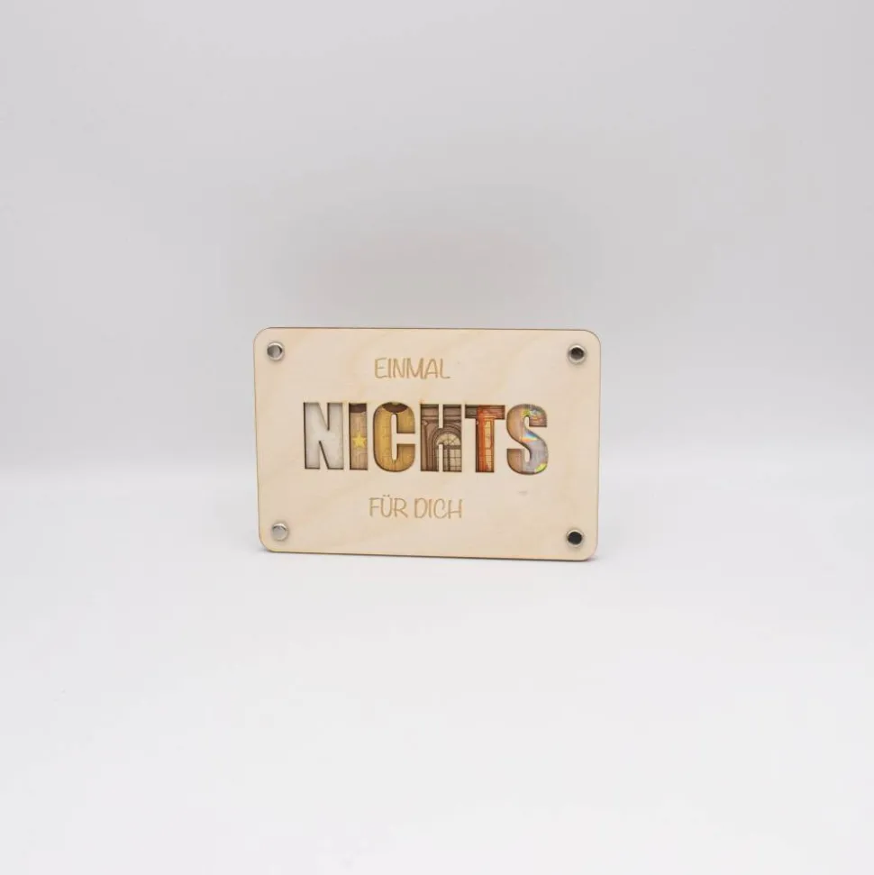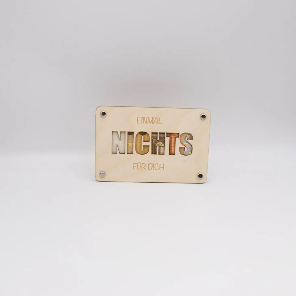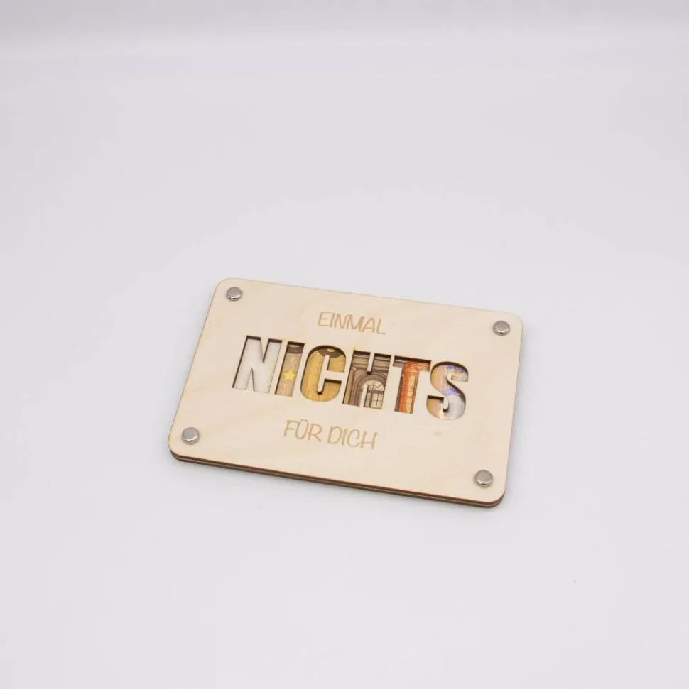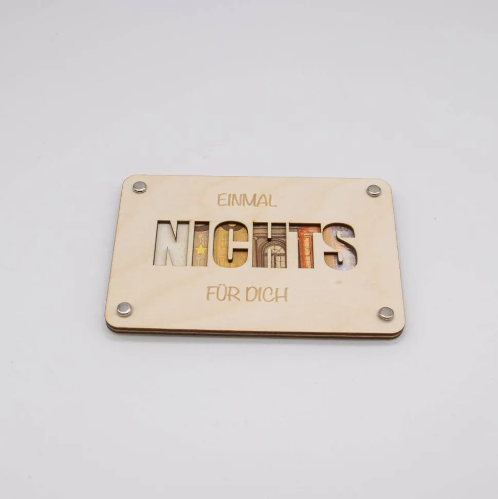 Das Herzstück dieses Produktes ist der ausgelaserte Schriftzug „NICHTS“ auf der Vorderseite, der den Satz „Einmal Nichts für Dich“ symbolisiert. Dieser Schriftzug ist sorgfältig mit einem Laser ausgeschnitten, um präzise und klare Konturen zu schaffen, die einen raffinierten Blick auf das eingelegte Geld ermöglichen. Die Karte besteht aus zwei Platten, die jeweils mit mehreren Löchern versehen sind. Diese Löcher dienen dazu, Klammern durchzustecken, mit denen die Platten zusammengehalten und das Geld sicher zwischen ihnen fixiert wird.