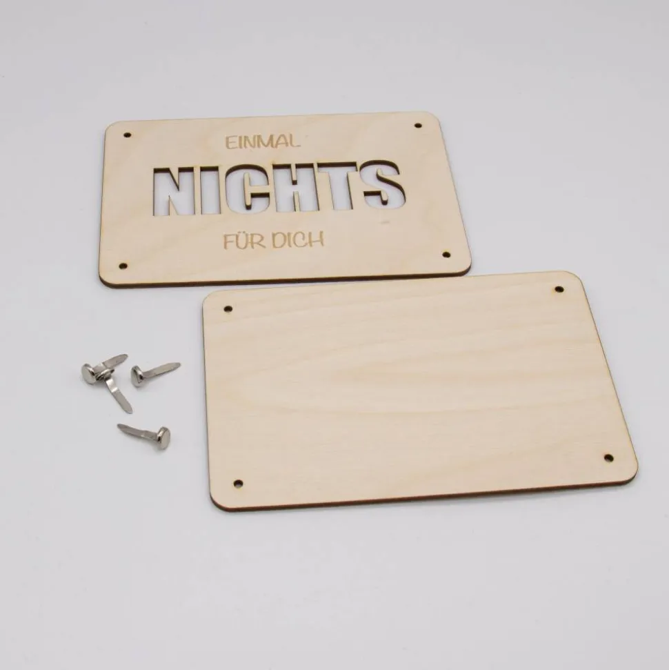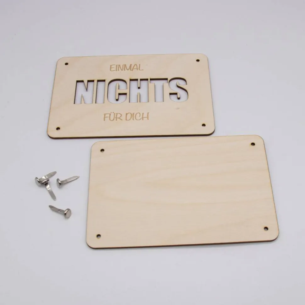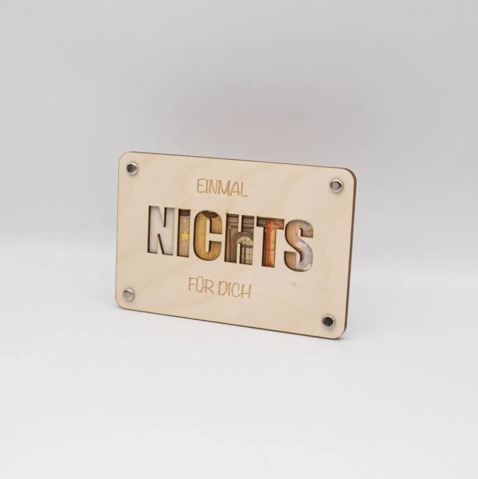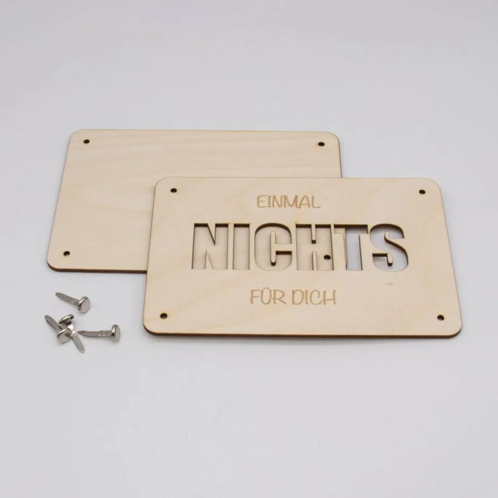 Das Herzstück dieses Produktes ist der ausgelaserte Schriftzug „NICHTS“ auf der Vorderseite, der den Satz „Einmal Nichts für Dich“ symbolisiert. Dieser Schriftzug ist sorgfältig mit einem Laser ausgeschnitten, um präzise und klare Konturen zu schaffen, die einen raffinierten Blick auf das eingelegte Geld ermöglichen. Die Karte besteht aus zwei Platten, die jeweils mit mehreren Löchern versehen sind. Diese Löcher dienen dazu, Klammern durchzustecken, mit denen die Platten zusammengehalten und das Geld sicher zwischen ihnen fixiert wird.