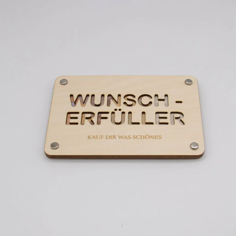 Funktionsweise: Die Karte besteht aus zwei sorgfältig zugeschnittenen Holzplatten, die jeweils 3mm dick sind. Die Platten sind mit präzisen Löchern versehen, durch die kleine Klammern gesteckt werden können, um die Platten zusammenzuhalten. Zwischen diesen beiden Holzplatten wird das Geld platziert. Durch die kunstvoll ausgelaserten Stellen des Wunscherfüller-Motivs ist das Geld sichtbar und wird so Teil des Gesamtdesigns.