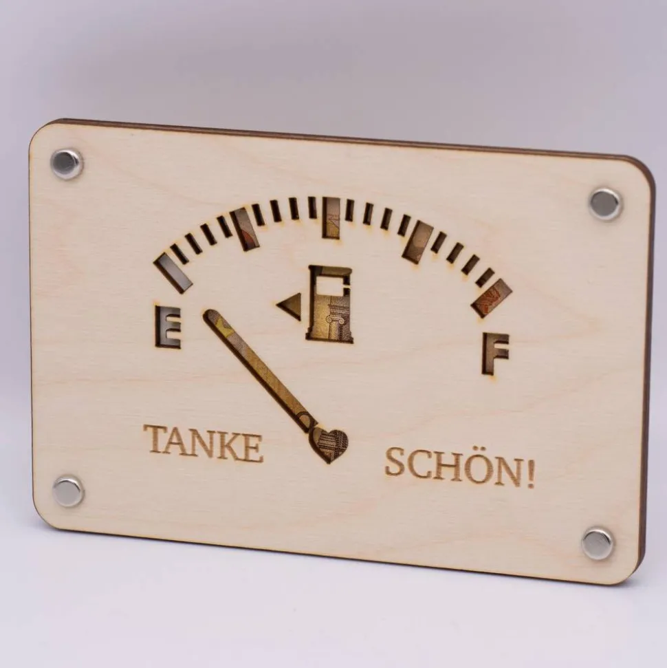 Das Geschenk besteht aus zwei hochwertigen Holzplatten, die durch vier edle Musterklammern verbunden werden. Das besondere Highlight: Eine präzise gelaserte Tankanzeige mit der Aufschrift „Tanke schön“, durch die das eingelegte Geldscheingeschenk sichtbar bleibt. So wird aus einem einfachen Geldgeschenk eine kreative Überraschung mit persönlicher Note!
