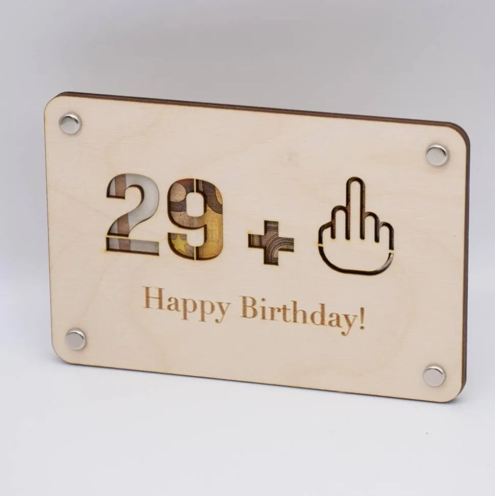 Dieses Geschenk besteht aus zwei hochwertig gelaserten Holzplatten, die mit einem ausgefallenen Motiv versehen sind: eine große ausgelaserte Zahl, ein provokanter Mittelfinger und die freche Aufschrift „Happy Birthday“. Durch das Motiv kann das Geld sichtbar durchscheinen, was für einen besonderen Überraschungseffekt sorgt.