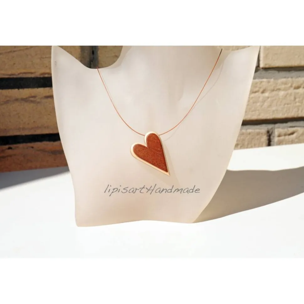 Der Holzanhänger hängt an einem edlen kupferfarbenen Juwelierdraht.