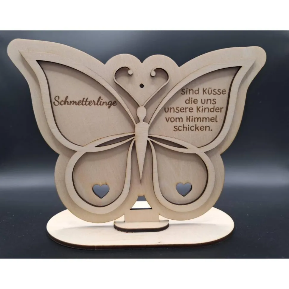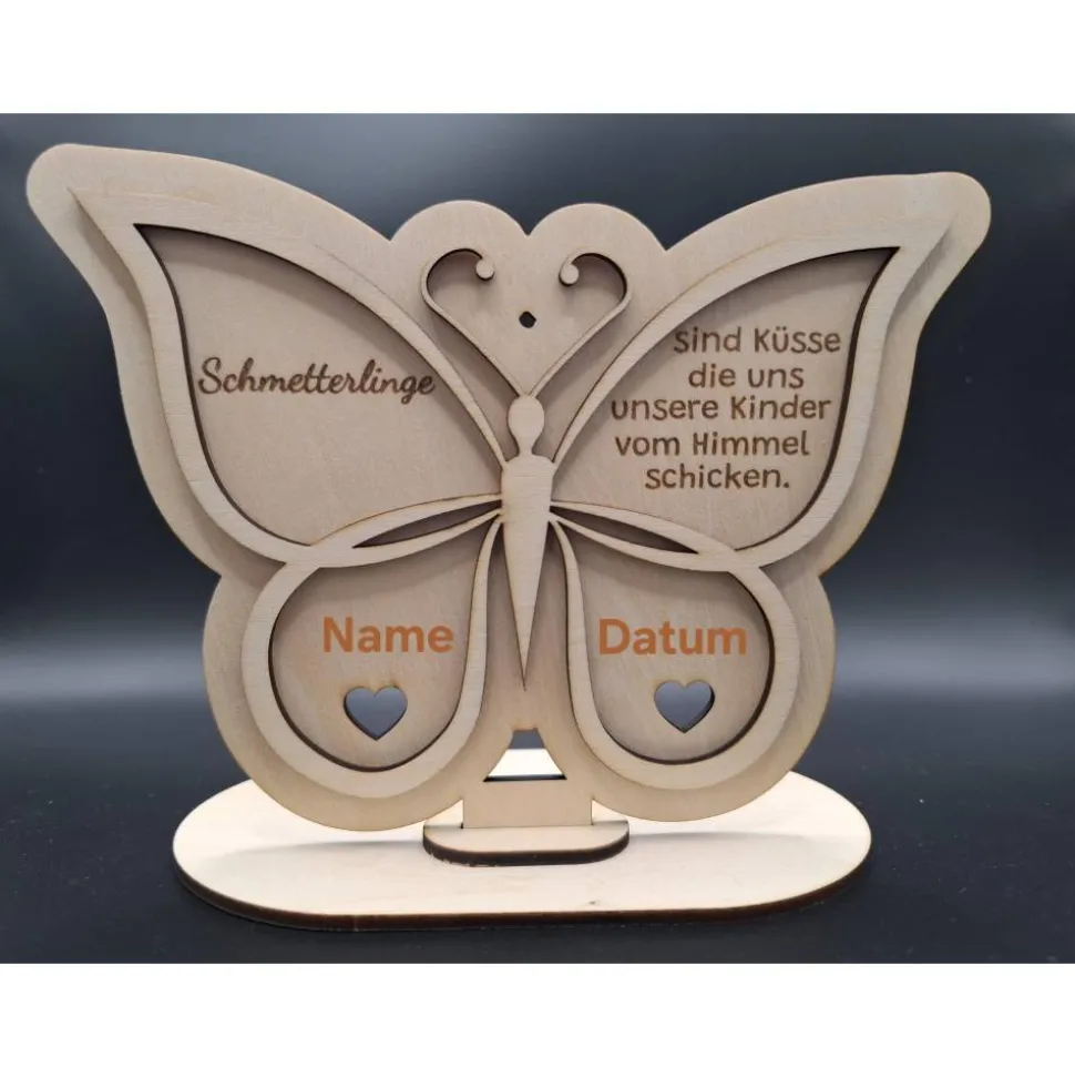 Das Schild kann mit einem LED-Teelicht kombiniert werden, das sanftes Licht spendet und eine beruhigende Umgebung schafft. Dieses Schmetterlingholzschild ist mehr als nur Dekoration, es ist ein Symbol der Liebe und des Gedenkens und soll Dir helfen, die Verbindung zu Deinem geliebten Sternenkind aufrechtzuerhalten. Wir fertigen unsere Produkte mit viel Liebe und hoffen so ein klein wenig Trost und Frieden in schwierige Zeiten zu bringen.