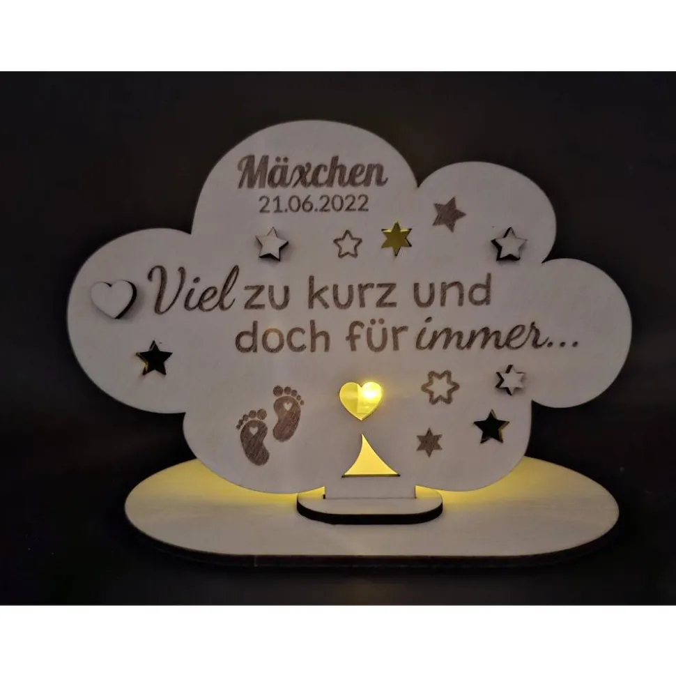 Das Schild kann mit einem LED-Teelicht kombiniert werden, das sanftes Licht spendet und eine beruhigende Umgebung schafft. Dieses Wolkenholzschild ist ein Symbol der Liebe und des Gedenkens und hilft, die Verbindung zu Deinem geliebten Sternenkind aufrechtzuerhalten. Wir fertigen unsere Produkte mit viel Liebe und hoffen so ein klein wenig Trost und Frieden in schwierige Zeiten zu bringen.