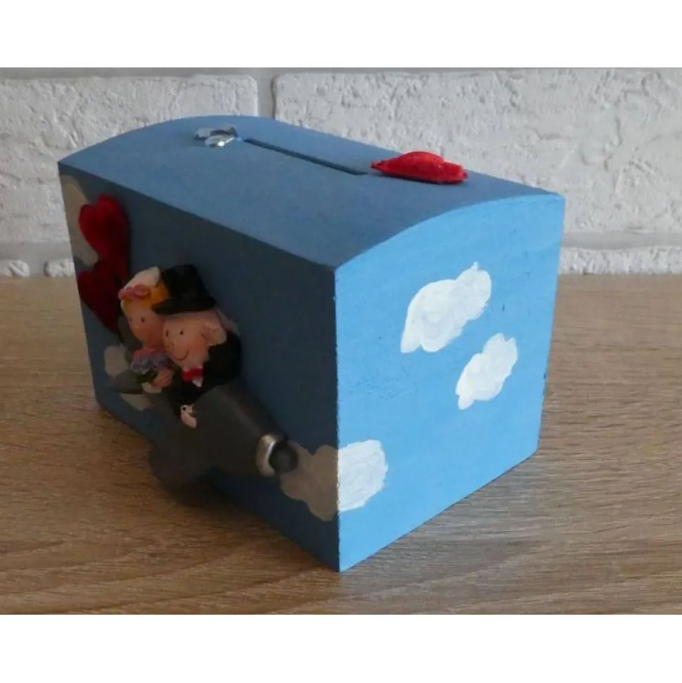 Die Holzspardose wurde mit Acrylfarben bemalt und mit einer Brautpaarfigur, Stoffherzen und Strasssteinen verziert.