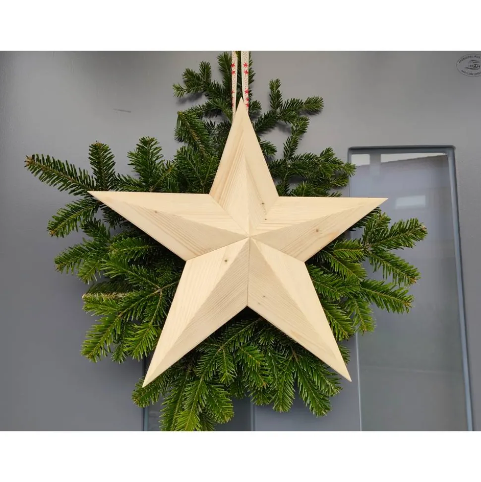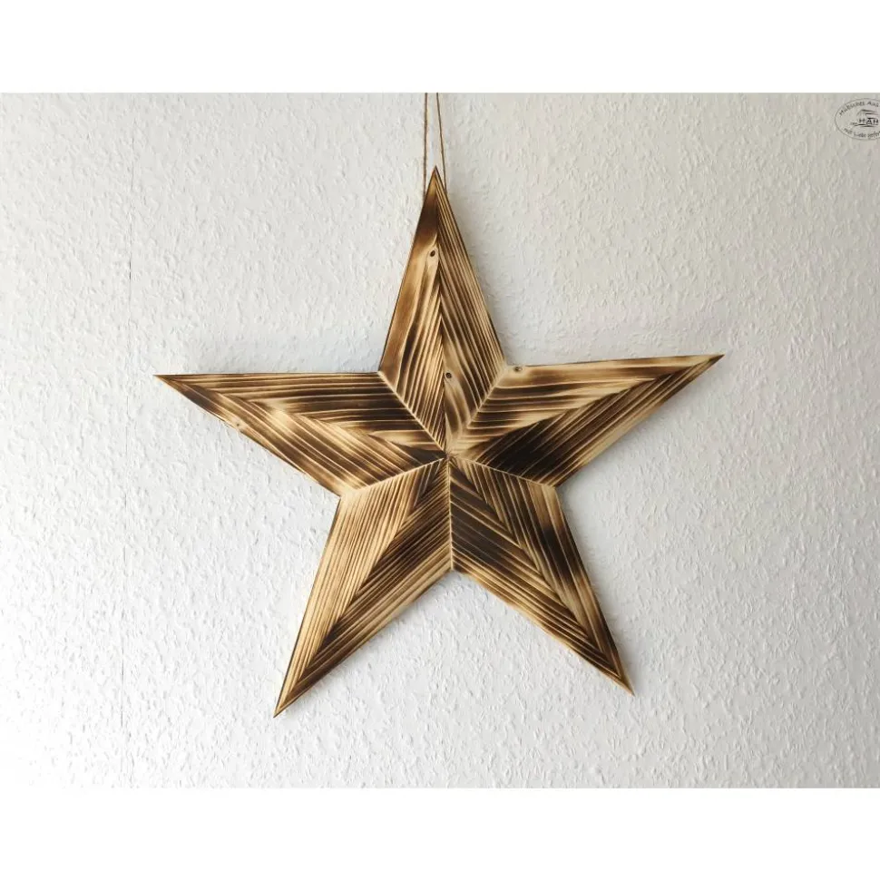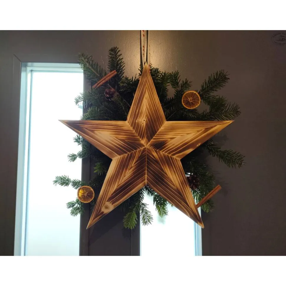 Der große Holzstern in dreidimensionaler Optik aus geflammtem Fichtenholz (ohne Dekoration) ist ein festlicher Blickfang in der Advents- und Weihnachtszeit.