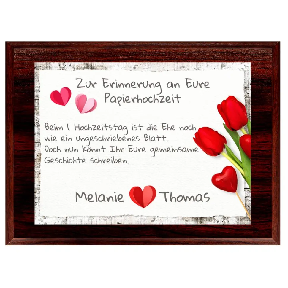 Die rot gemaserte Holztafel mit bedruckter Aluminium-Tafel zum Aufhängen ist eine bleibende Erinnerung mit einem schönen Spruch und personalisiert mit den Namen des Paares.