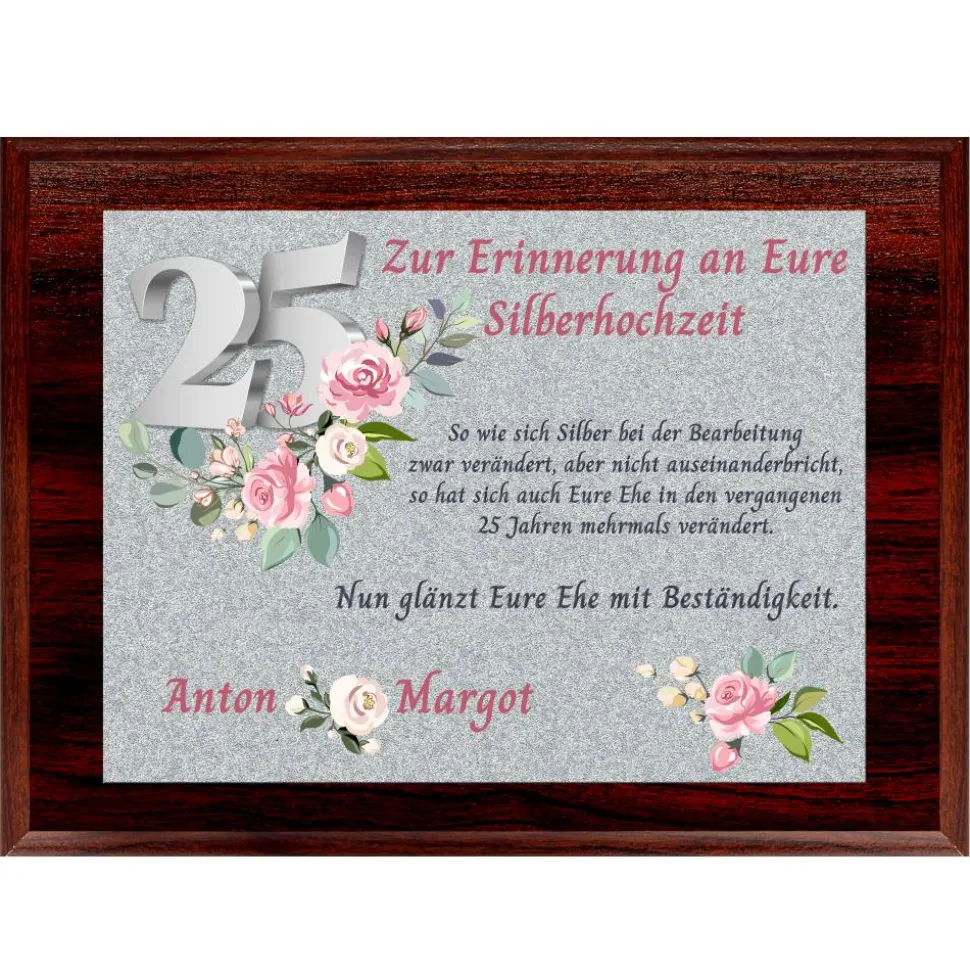 Darunter die Namen des Paares und das ganze auf einem silberfarbigen Design mit einer 25 und Blumen.