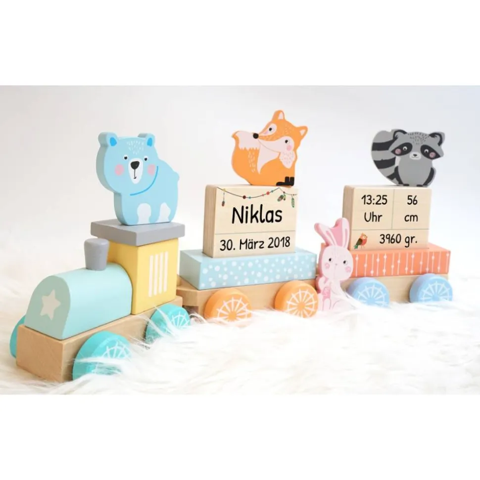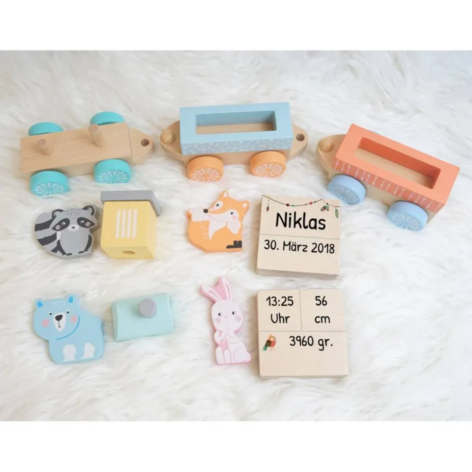 Die Waggons sind bestückt mit den Geburtsdaten von eurem Kind. Zusätzlich bekommt ihr die vier kleinen Holztiere die auf den Bildern ebenfalls zu sehen sind.
