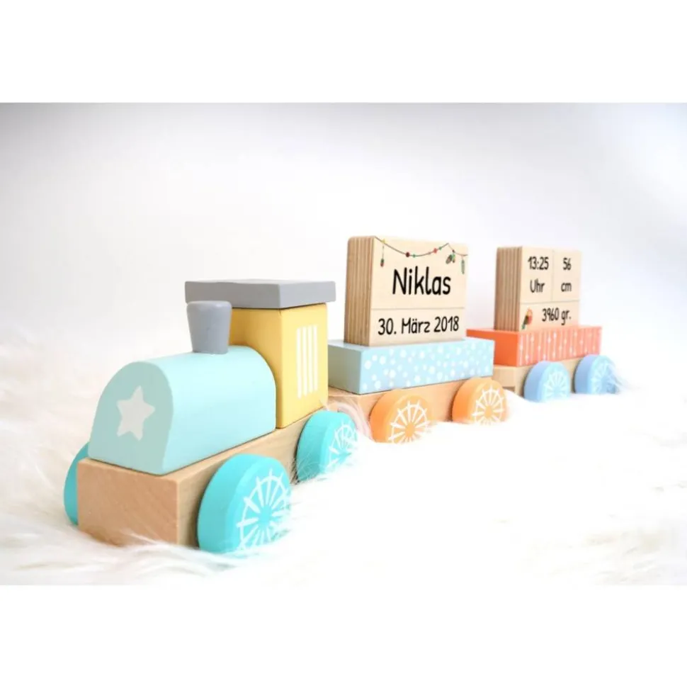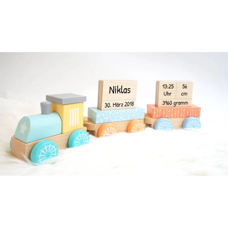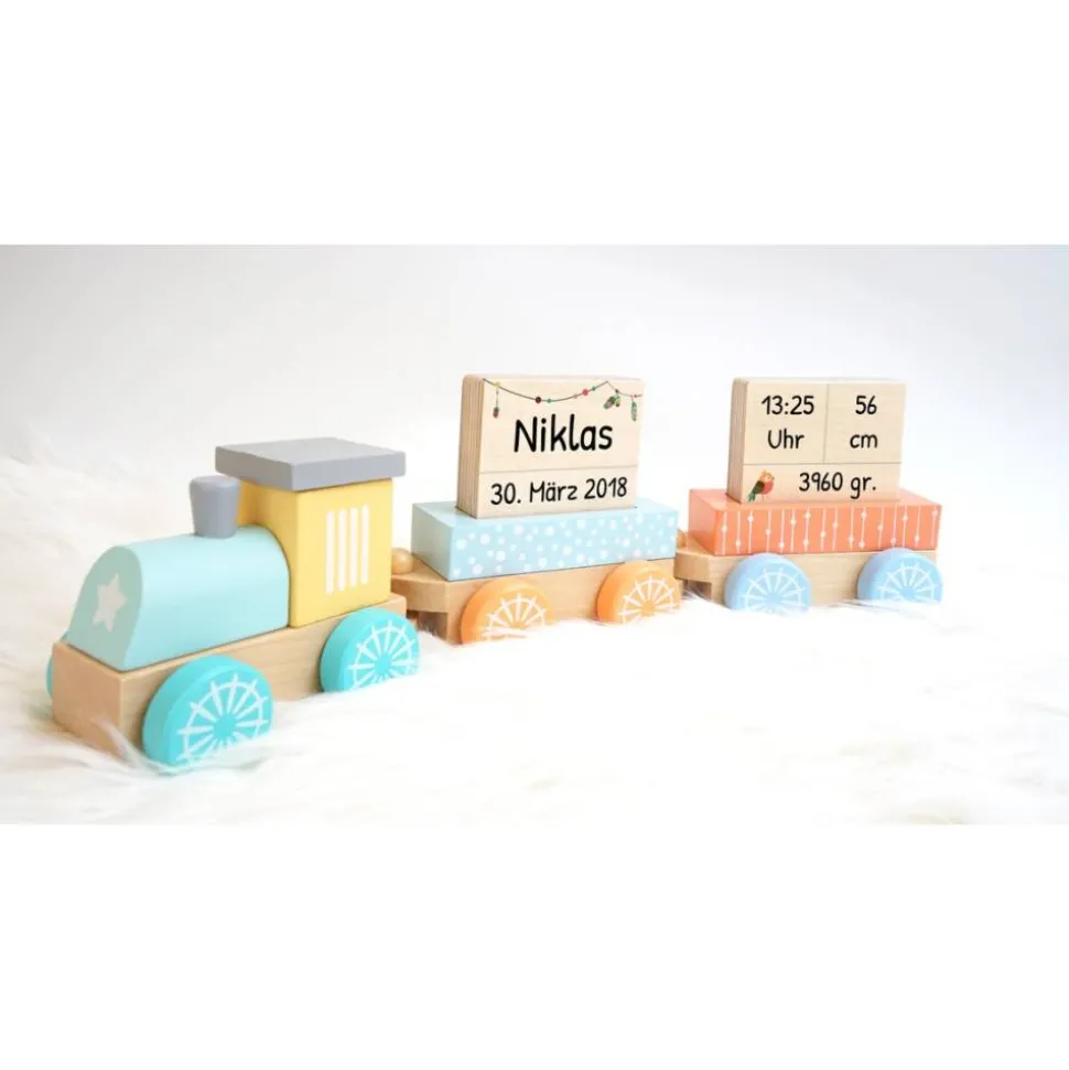 Dieser pastellfarbene Zug ist ein schönes Geschenk zur Geburt oder zur Taufe.