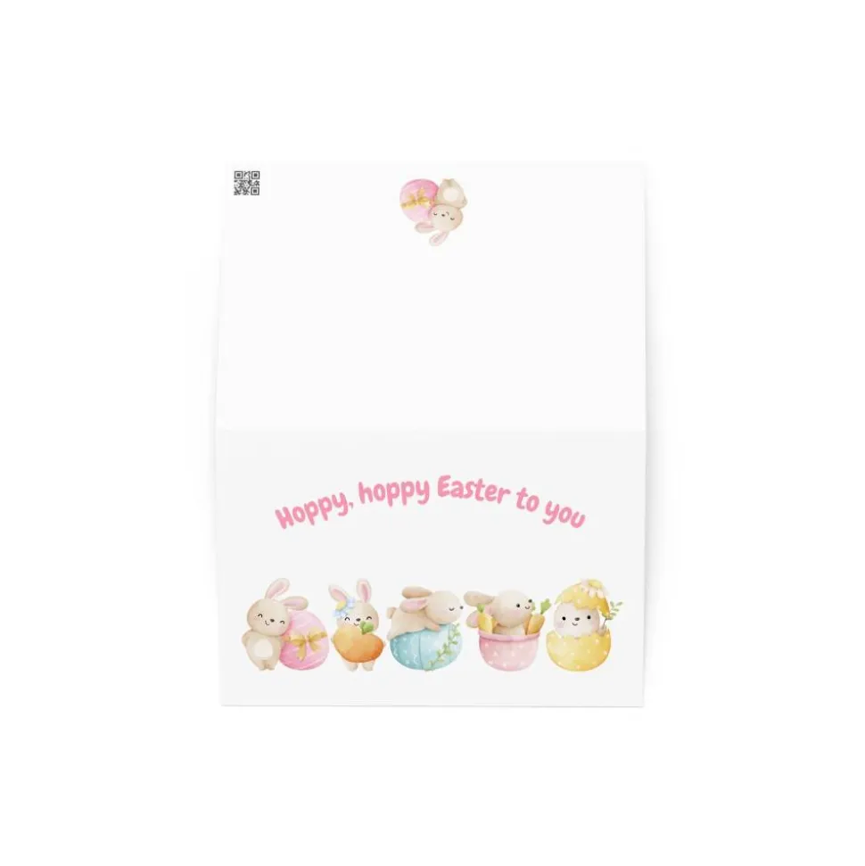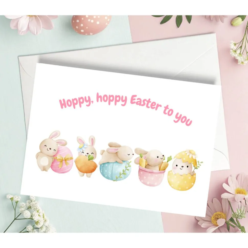 Die fröhliche Aufschrift „Hoppy, hoppy Easter to you“ spielt mit dem englischen Wort „hoppy“ und zaubert durch ihren humorvollen, liebevollen Ton zusätzlich gute Laune. Die farbenfrohe, moderne Schriftart fügt sich perfekt in das Design ein und setzt einen fröhlichen Akzent, der die Ostergrüße besonders herzlich wirken lässt. Der Hintergrund ist hell und freundlich gehalten, sodass die liebevollen Illustrationen klar hervorstechen und die Happy Easter Karte eine harmonische, einladende Gesamtwirkung erhält.