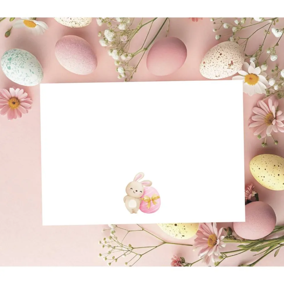 Im Zentrum der Osterkarte mit Umschlag stehen fünf süße Häschen, jedes mit seinem ganz eigenen Charakter: verspielt, neugierig, frech oder verträumt – gemeinsam sorgen sie für einen hinreißenden Hingucker. Die kleinen Fellfreunde sind mit zarten Details und sanften Farben gestaltet, wodurch das Motiv warm, freundlich und absolut herzerwärmend wirkt. Umgeben werden die Häschen von einer Vielzahl österlicher Elemente: bunte Ostereier mit liebevollen Mustern, zarte Frühlingsblumen und kleinen Karotten – all das verleiht der Häschen Ostergrußkarte einen lebendigen und frühlingshaften Look. Die harmonische Farbkombination aus Pastell- und Naturtönen unterstreicht die verspielte, frische Atmosphäre des Osterfestes. Auch auf der Rückseite der Karte für Ostern befindet sich ein kleiner Hase, der die Ostergruß Karte abrundet.