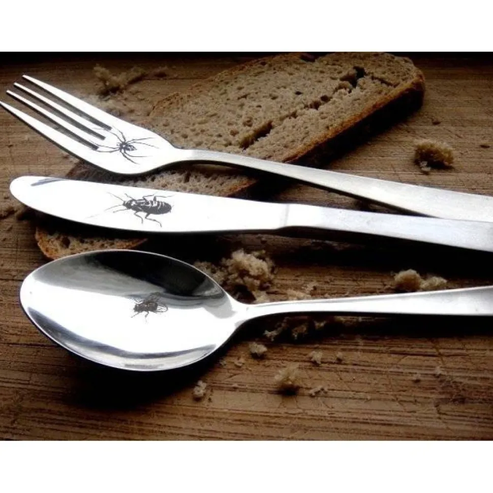 Messer, Gabel, Löffel, mit jeweils einem NATURGETREU GEZEICHNETEM Insekt eingelasert: