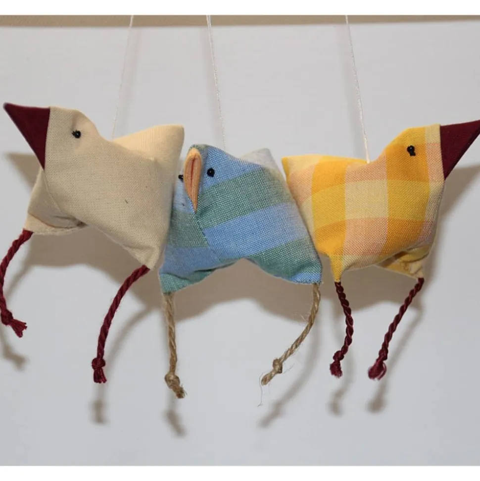 Die Hühner/Vögel sind aus Baumwollstoff gefertigt, die Beinchen sind aus Juteschnur, Baumwollkordel oder Satinkordel, gefüllt werden sie mit Wolle. Zum Aufhängen ist ein Baumwollzwirn angebracht.