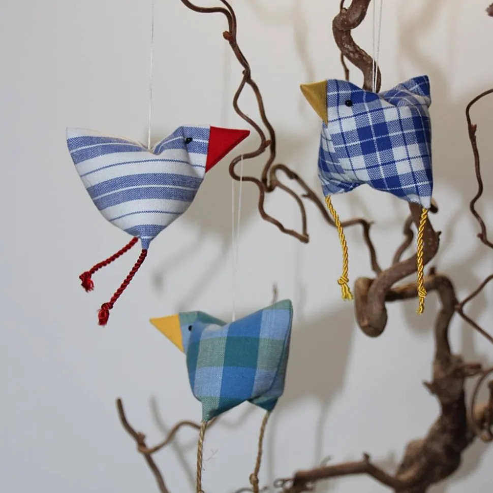 Die Hühner/Vögel sind aus Baumwollstoff gefertigt, die Beinchen sind aus Juteschnur, Baumwollkordel oder Satinkordel, gefüllt werden sie mit Wolle. Zum Aufhängen ist ein Baumwollzwirn angebracht.