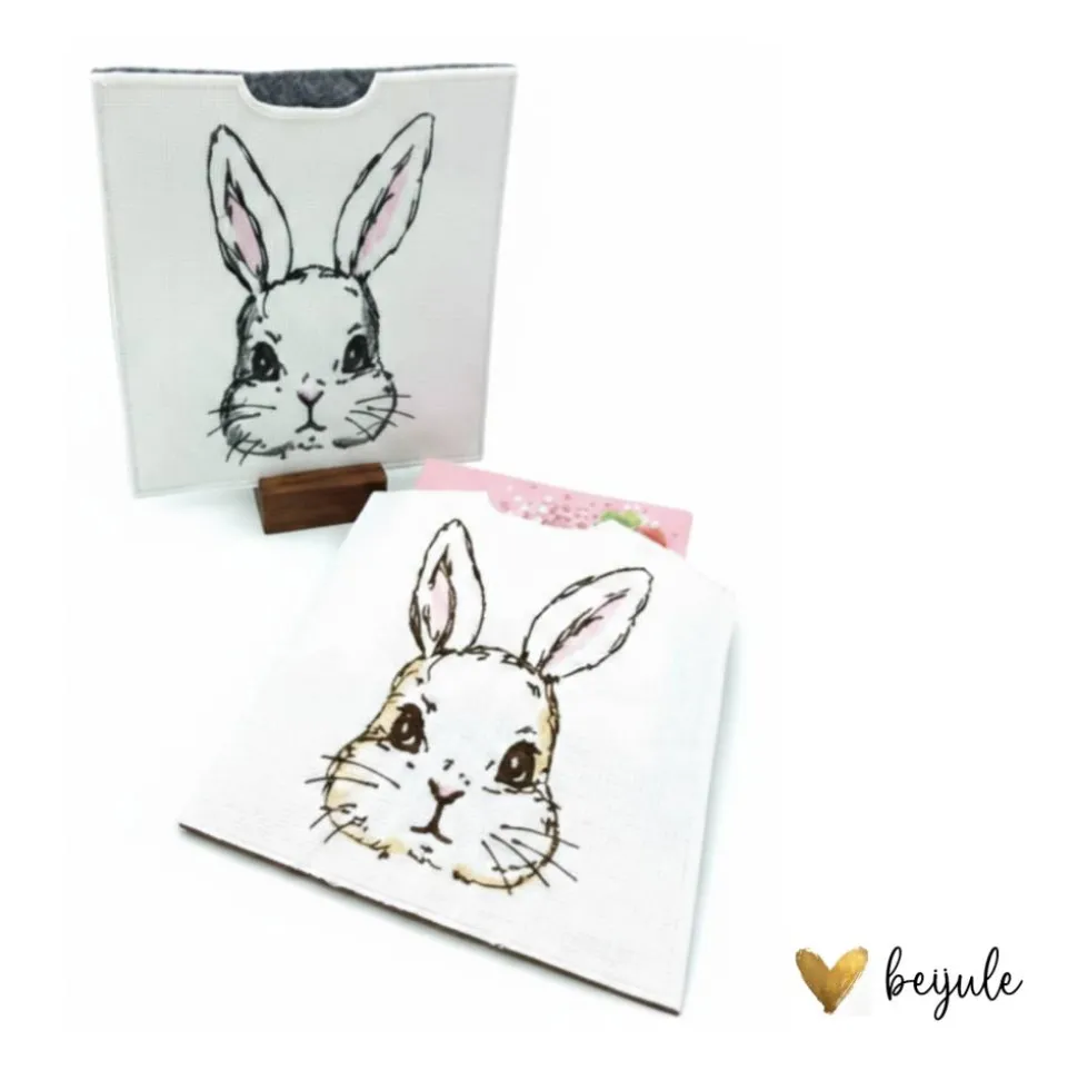 Diese dekorative Hasenhülle ist eine charmante Verpackungsidee für quadratische Schokolade/Schokoladenverpackungen und sorgt zu Ostern für eine besondere Überraschung. Der Hase wird wahlweise in warmen Braun- oder edlen Grautönen gestickt und mit zarten Rosatönen liebevoll akzentuiert.