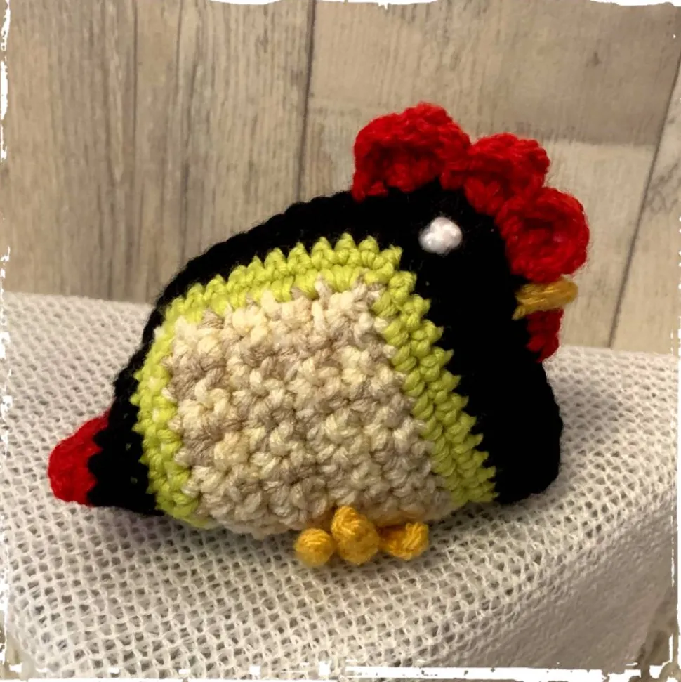 Das Huhn wurde gehäkelt und mit Füllwatte versehen. Das Gesicht sowie die Details wurden ebenfalls gehäkelt und angenäht.