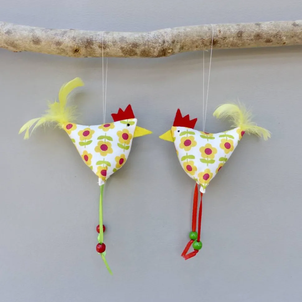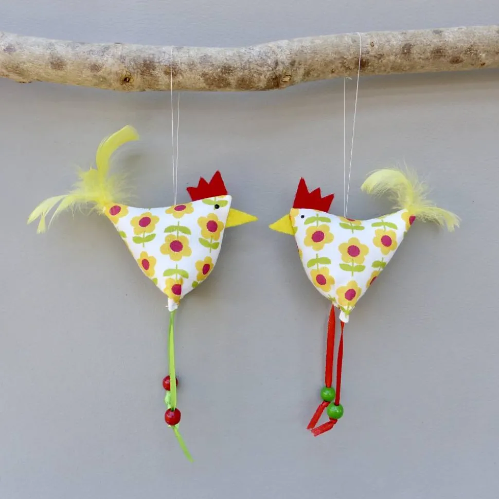 Die Stoffhühner sind gesund (können sitzen und am angebrachten Faden sogar fliegen)